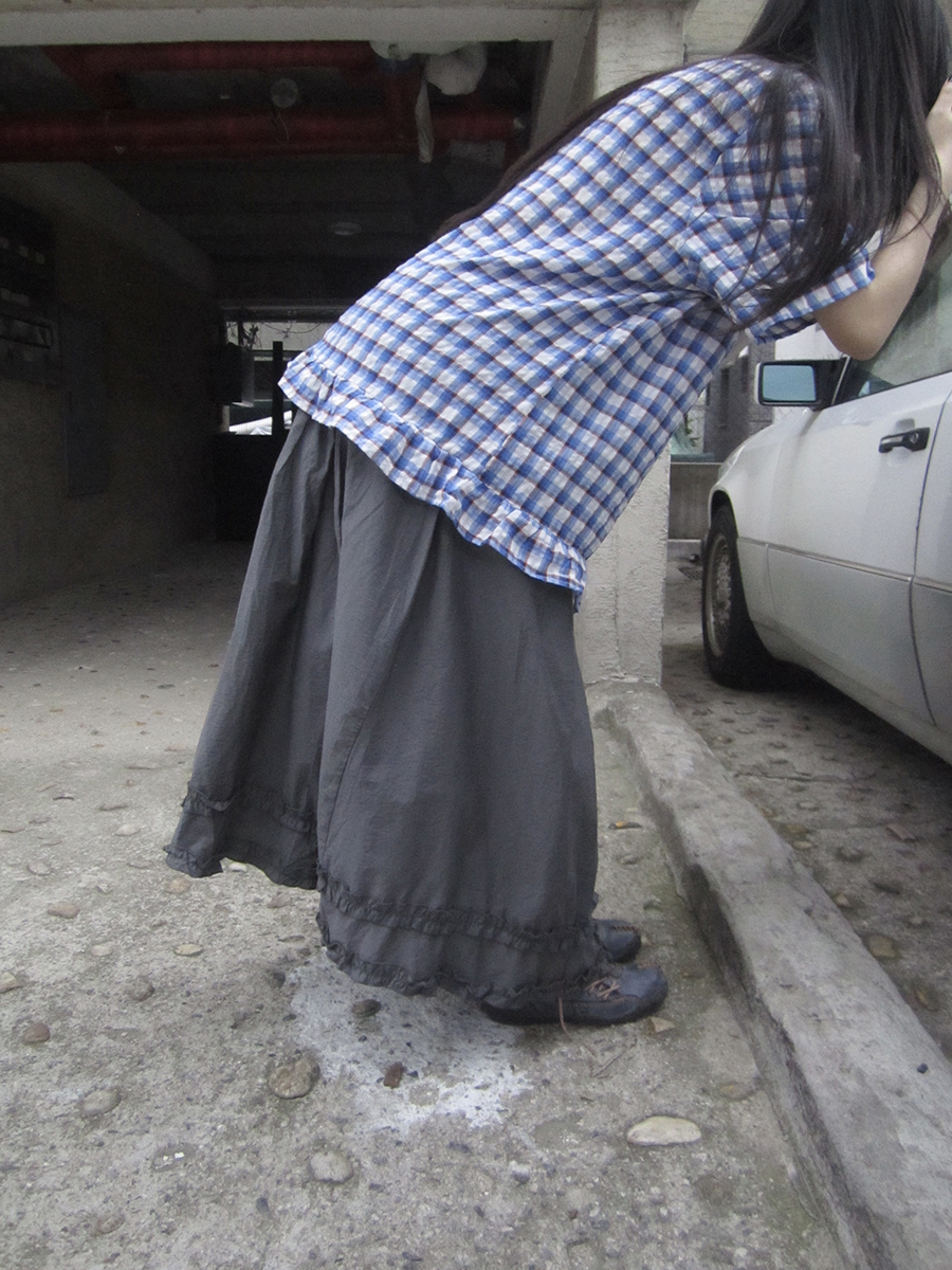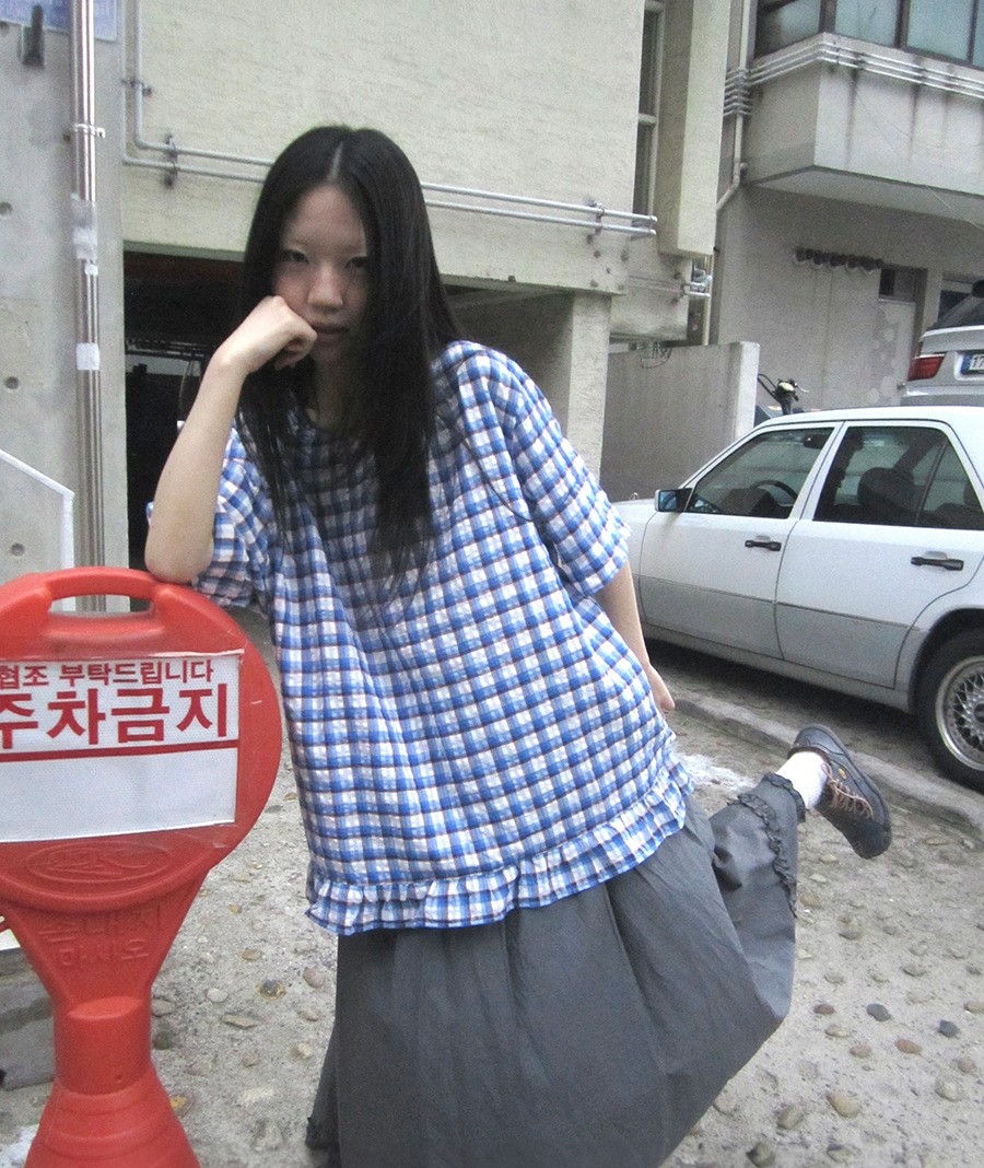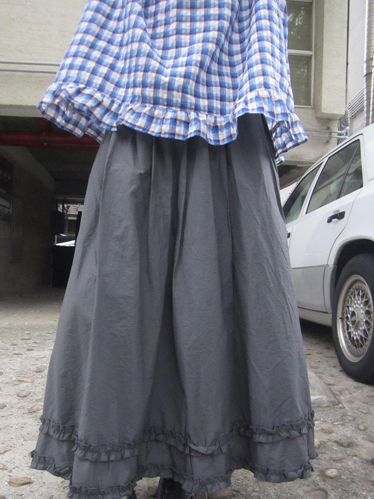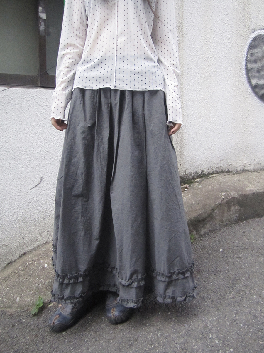 맥시한 그레이컬러 스커트에 프릴 장식이 들어가