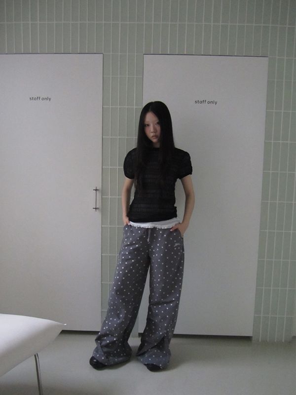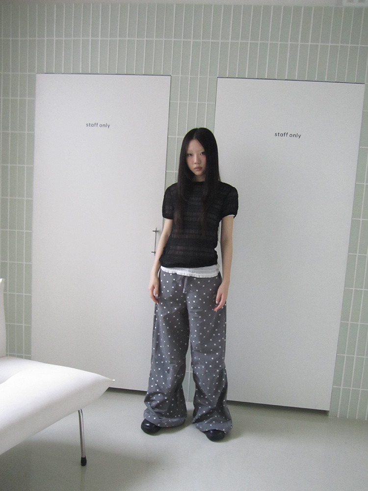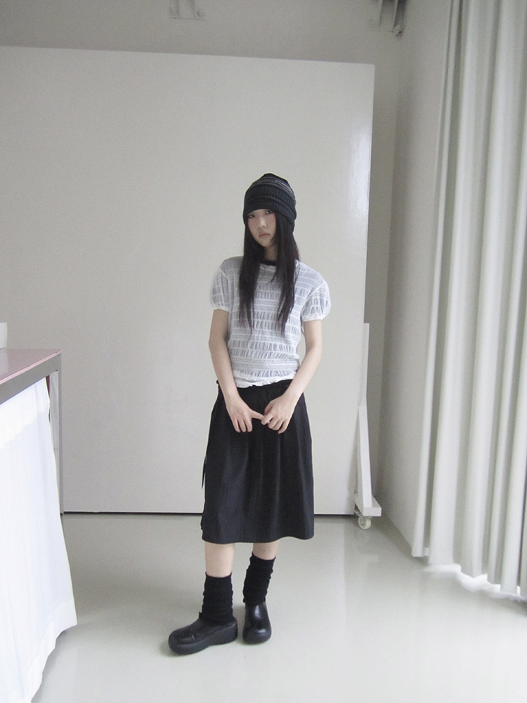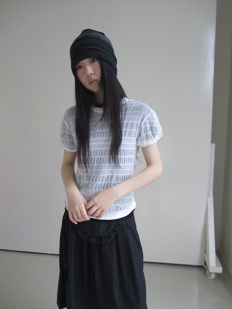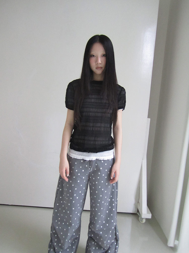 셔링원단으로 제작된 시스루 블라우스입니다.