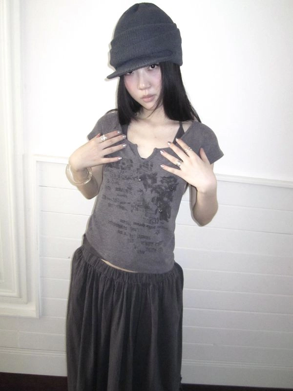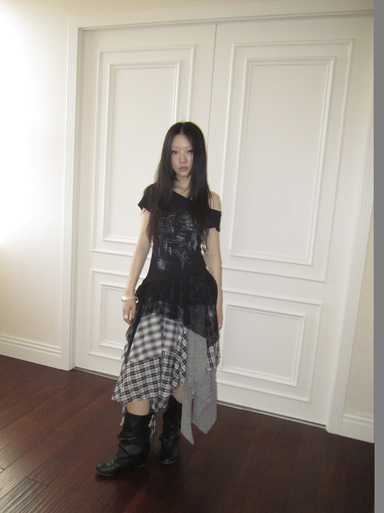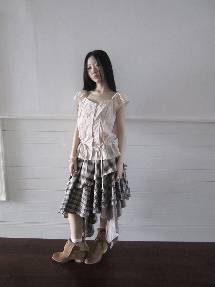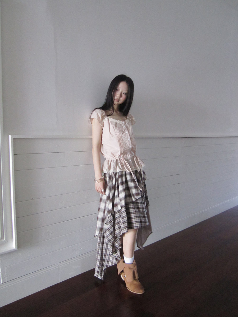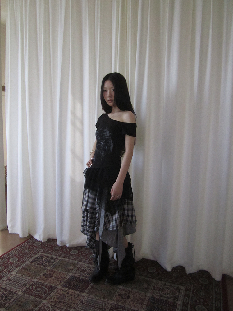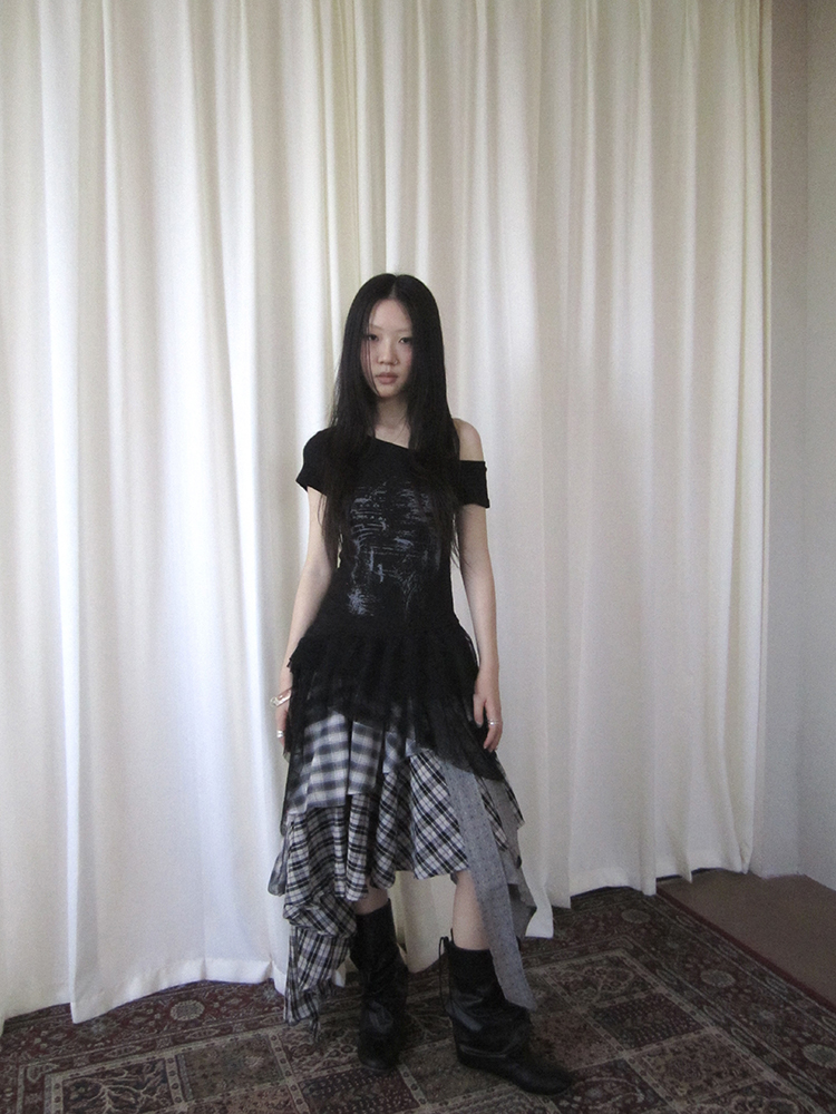 언발란스한 기장감이 시크하고 빈티지한 무드를 자아냅니다.