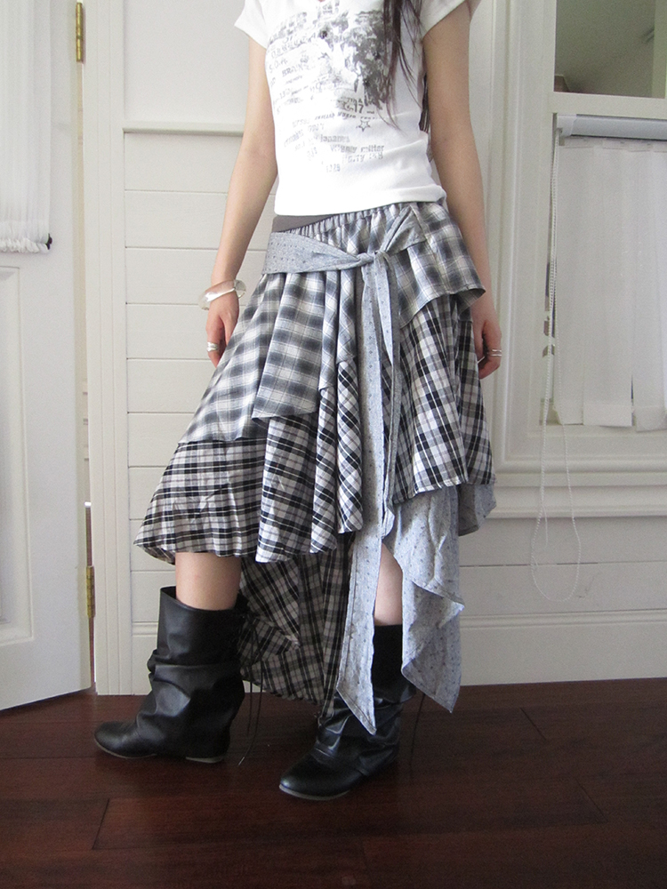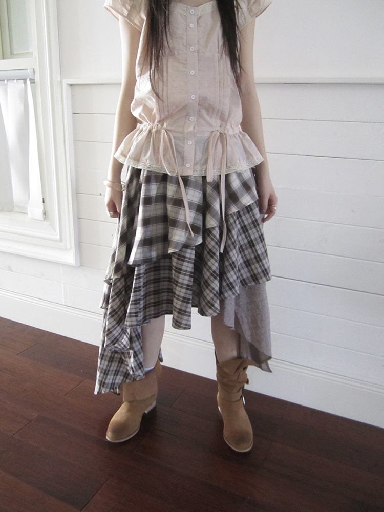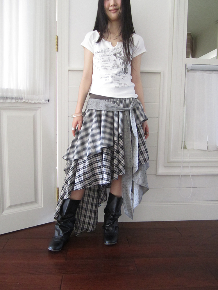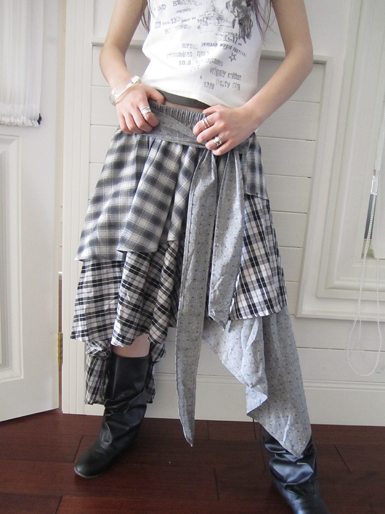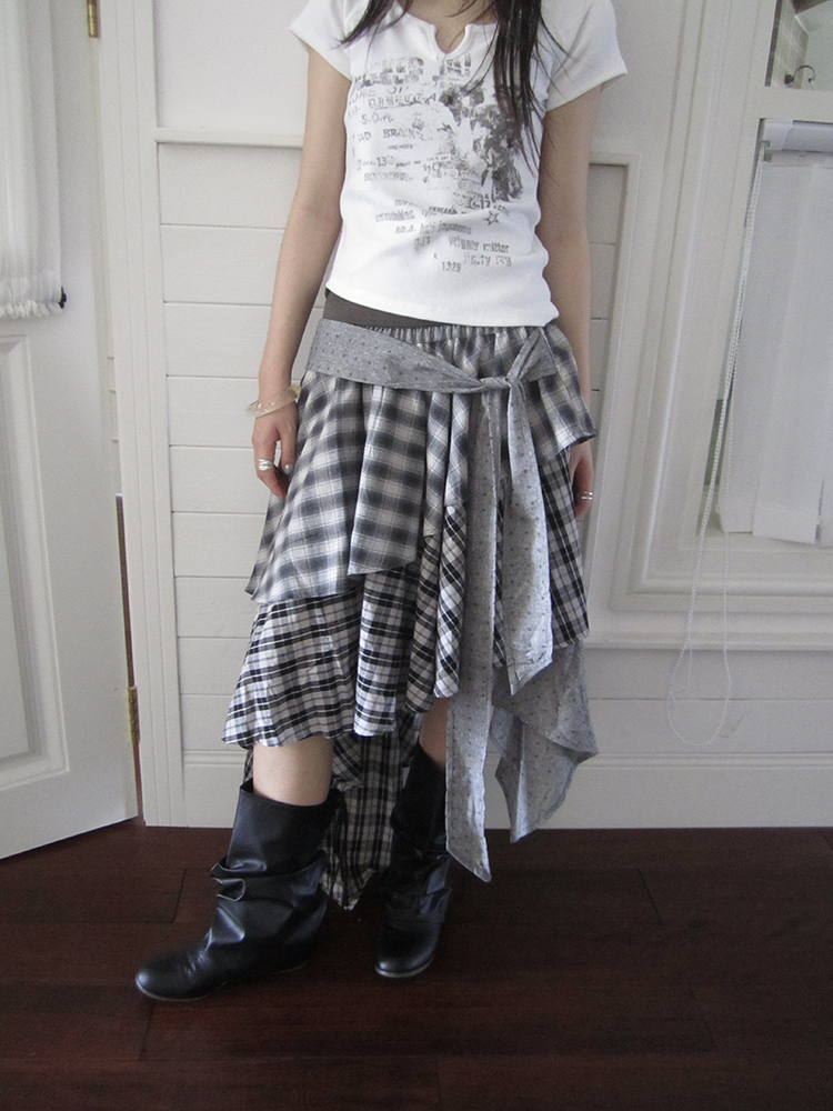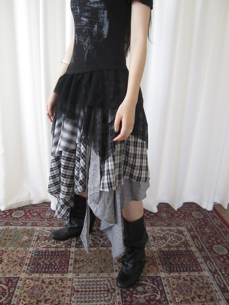 다양한 패턴의 원단이 레이어드된 스커트입니다.