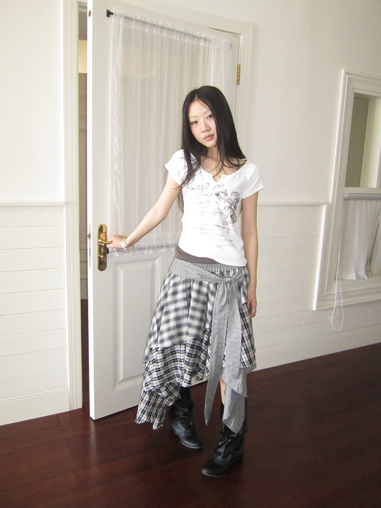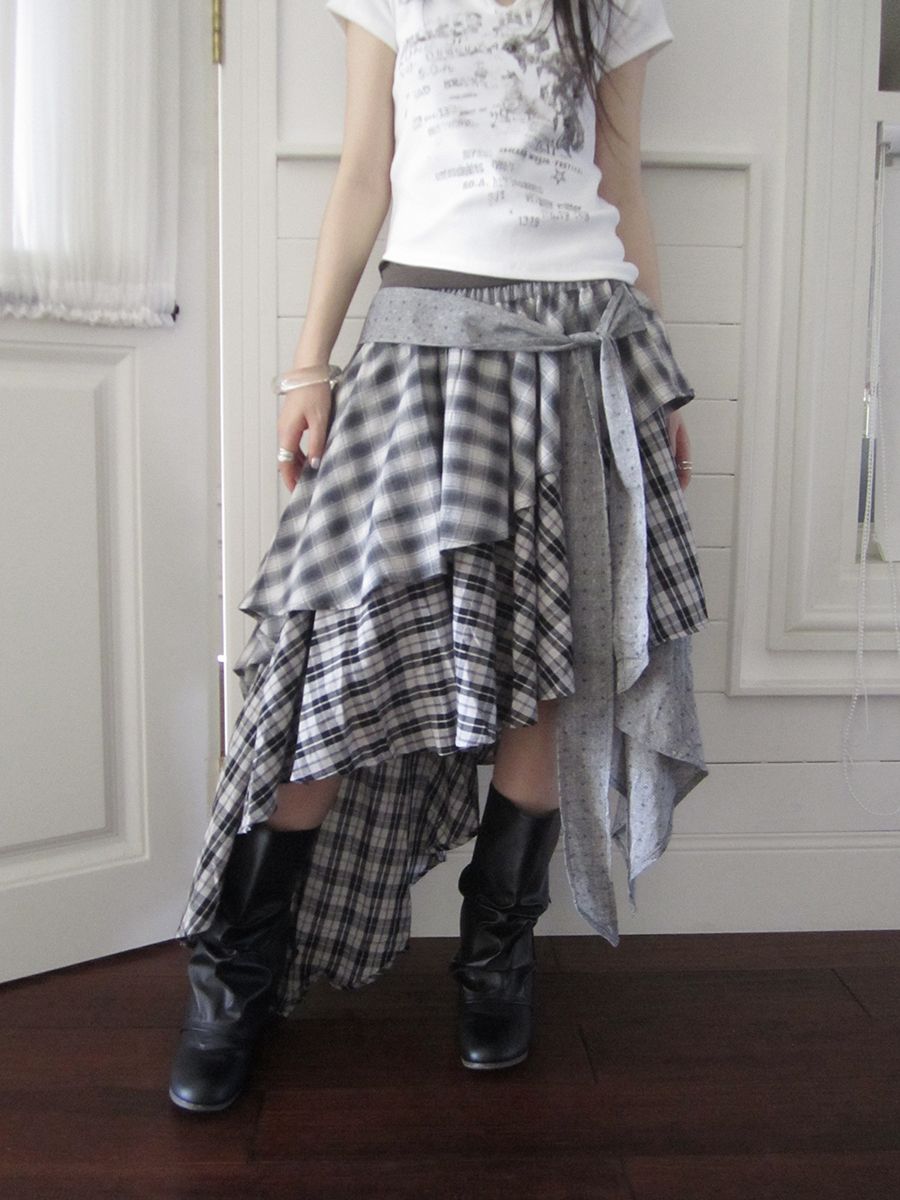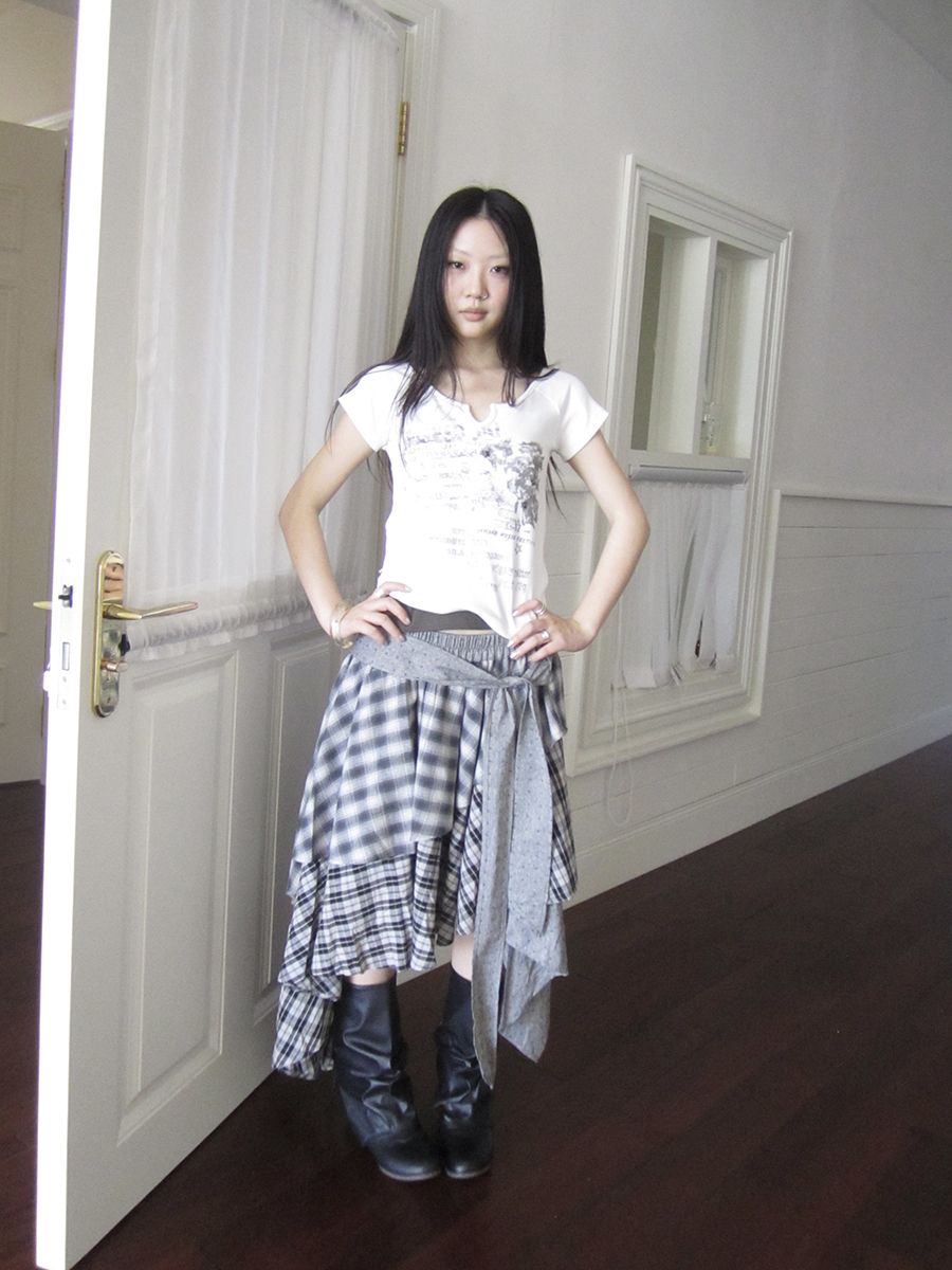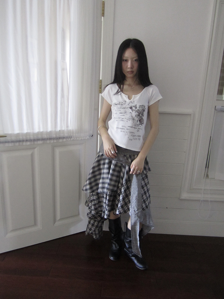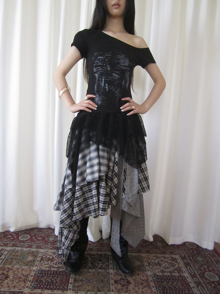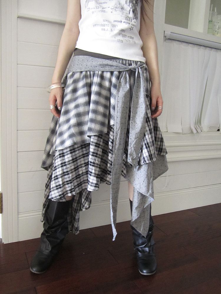 다양한 패턴의 원단이 레이어드된 스커트입니다.