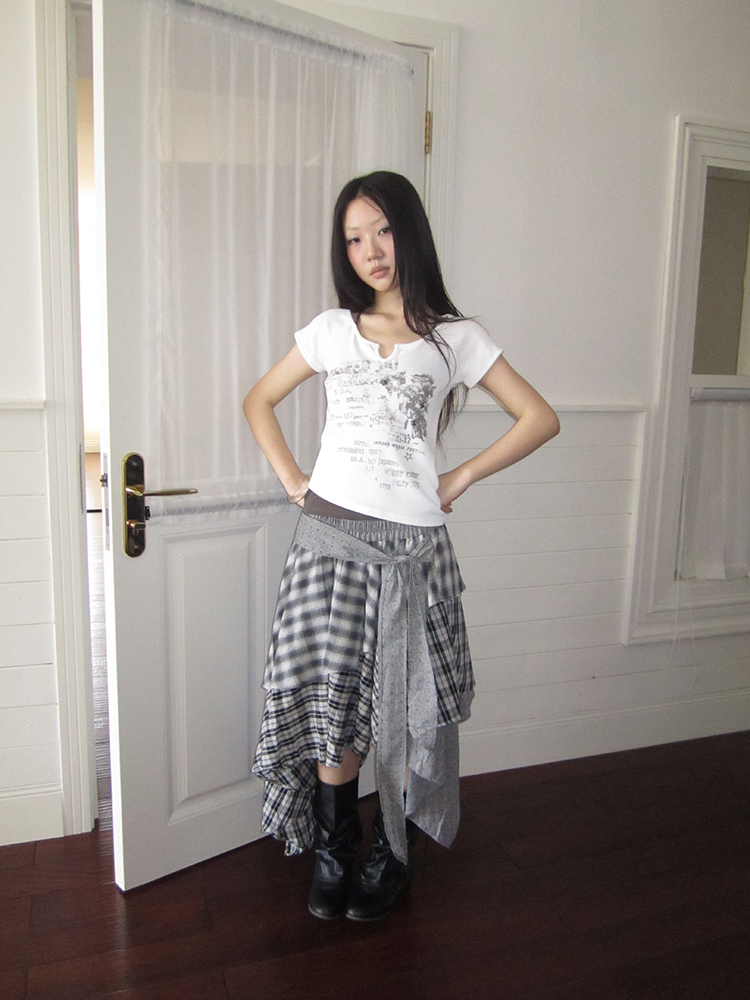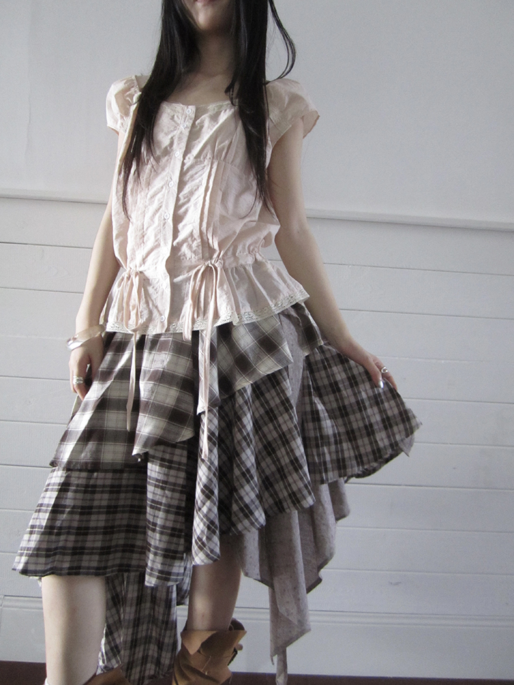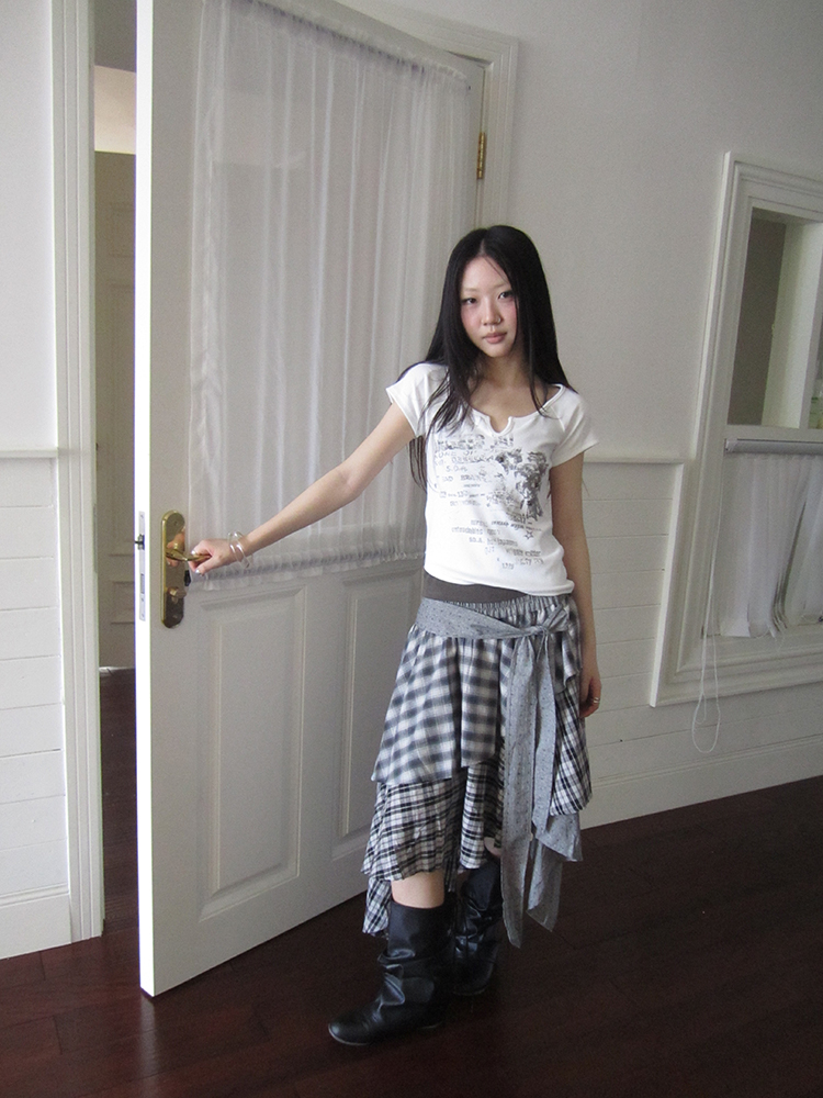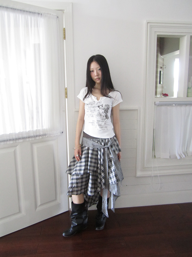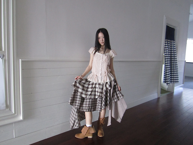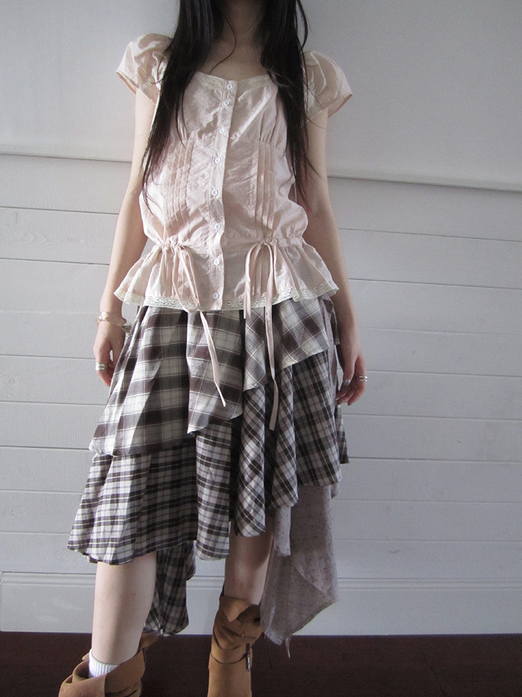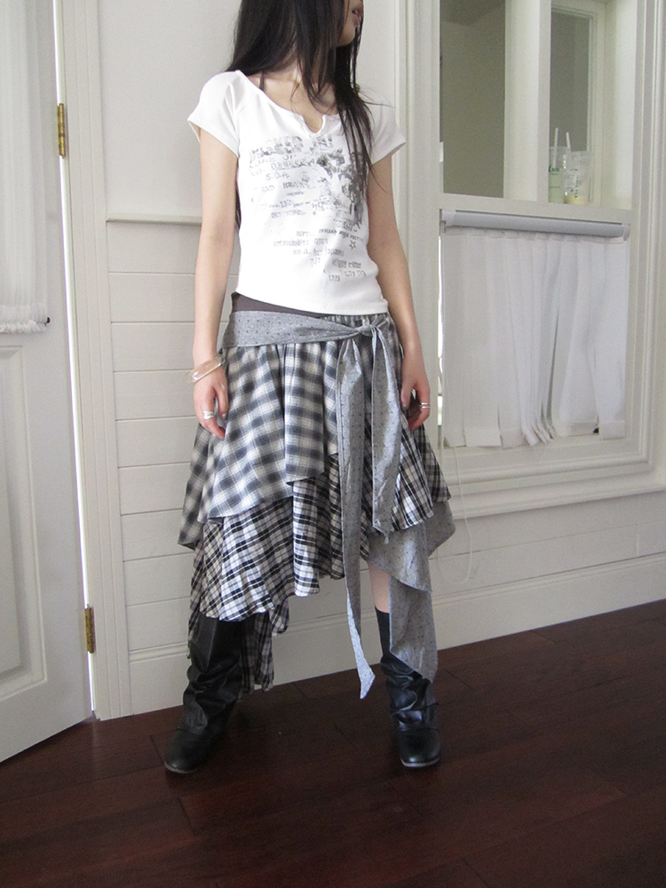 다양한 패턴의 원단이 레이어드된 스커트입니다.