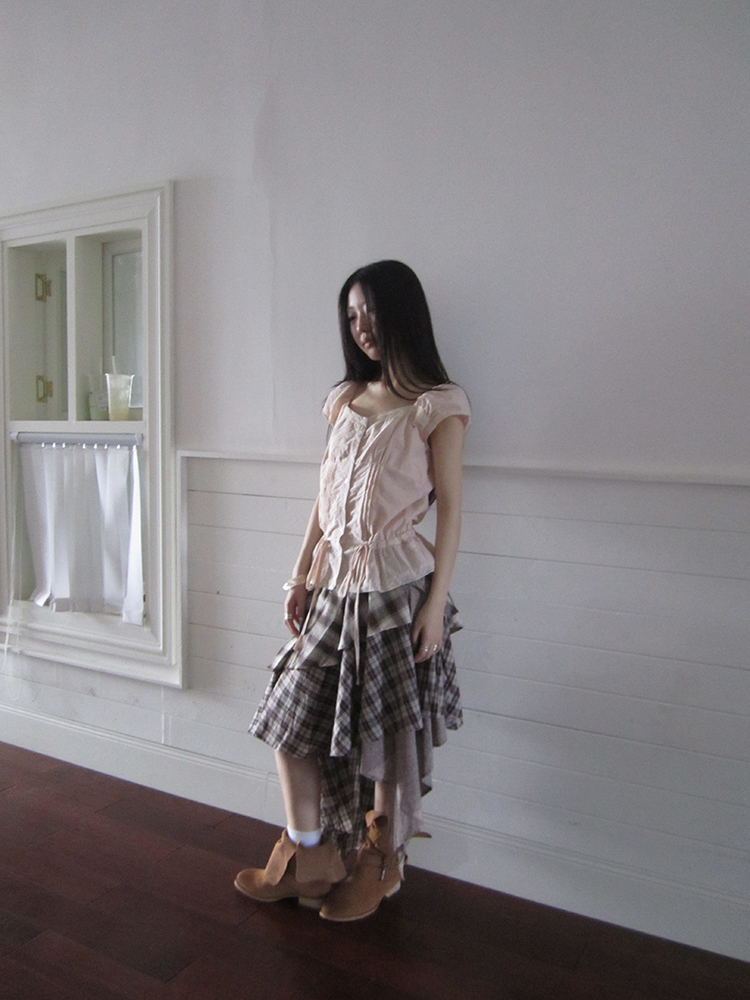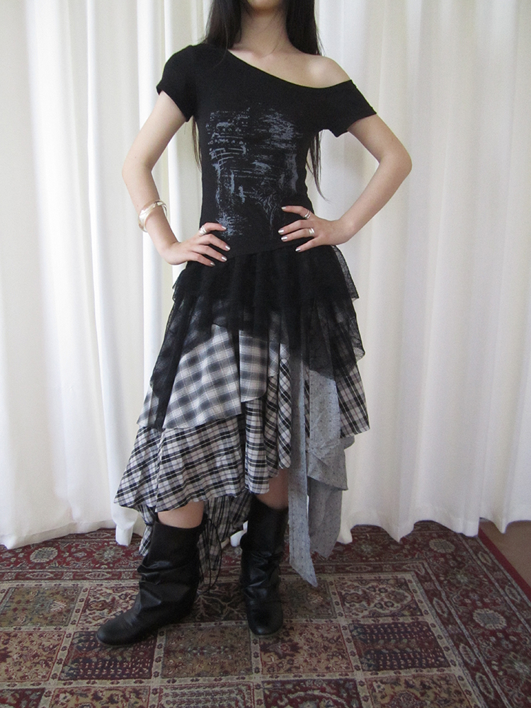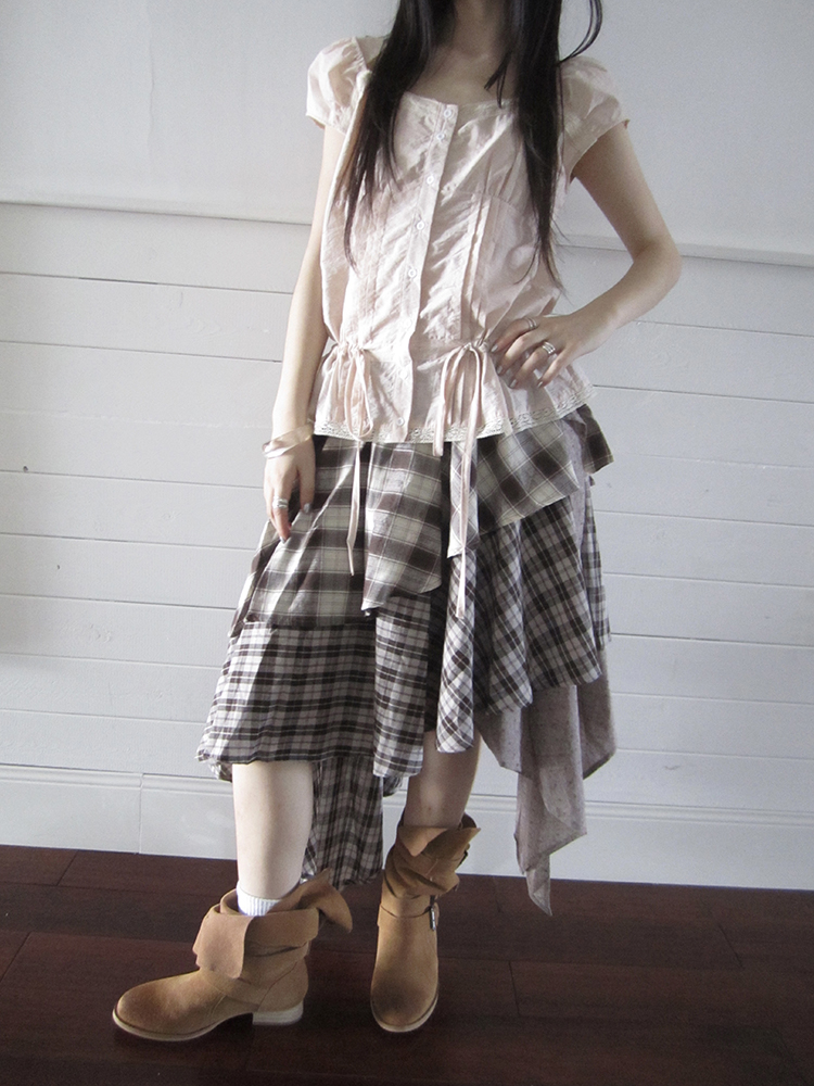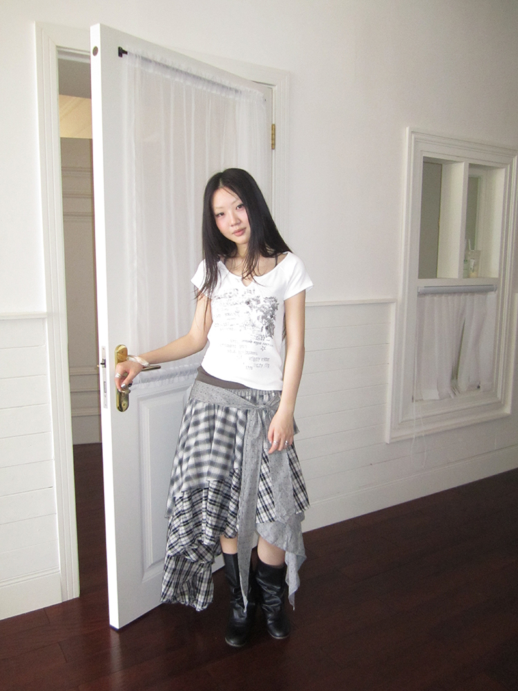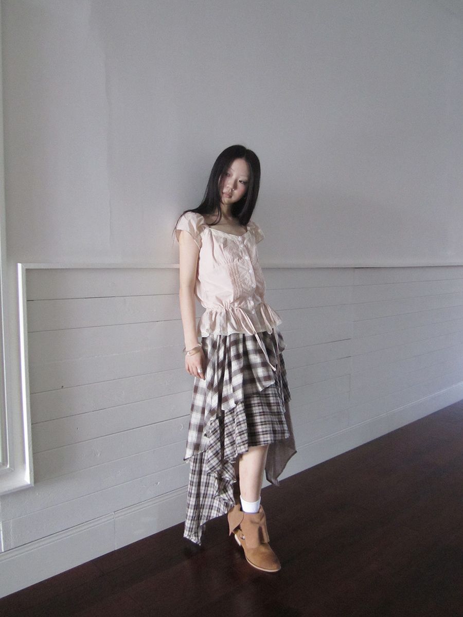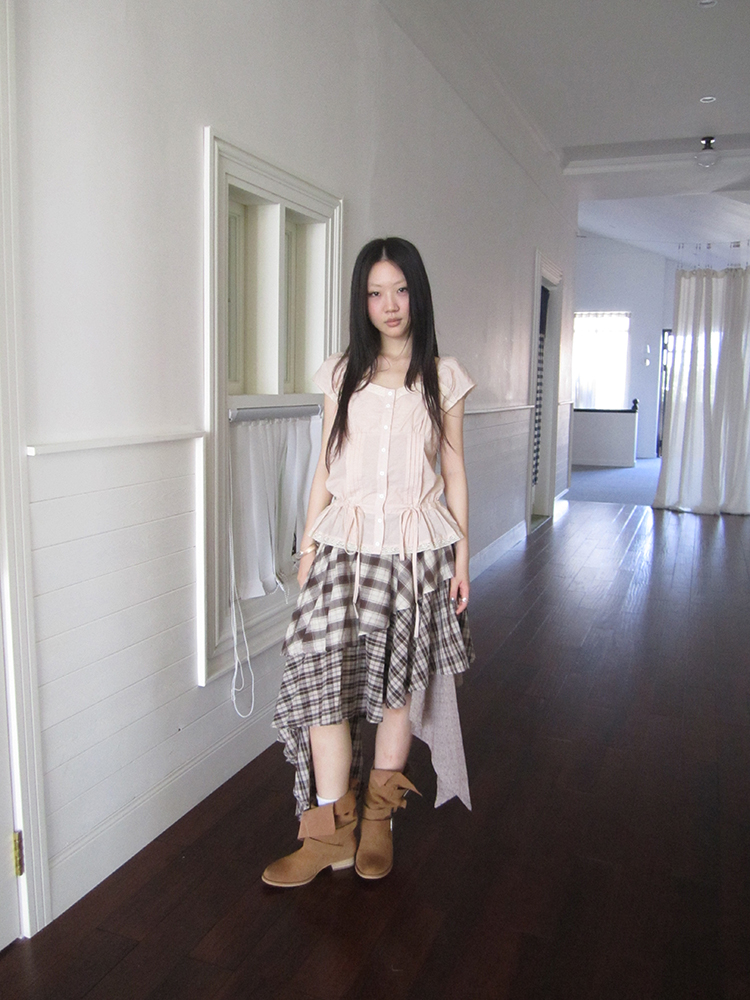 다양한 패턴의 원단이 레이어드된 스커트입니다.