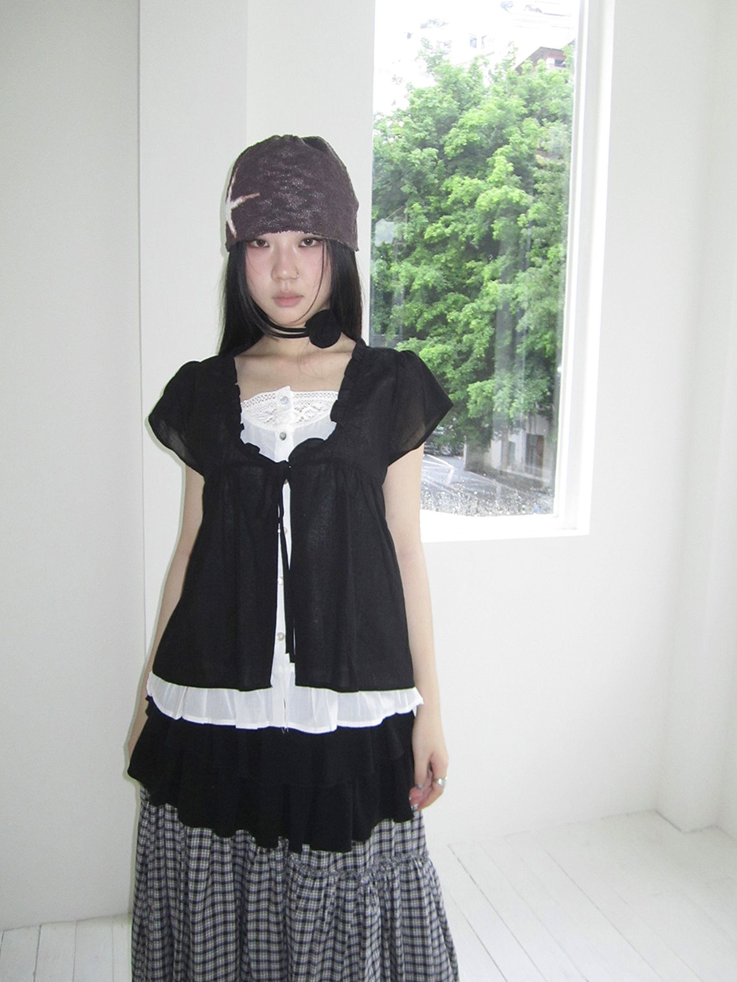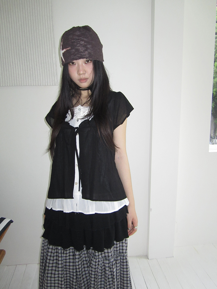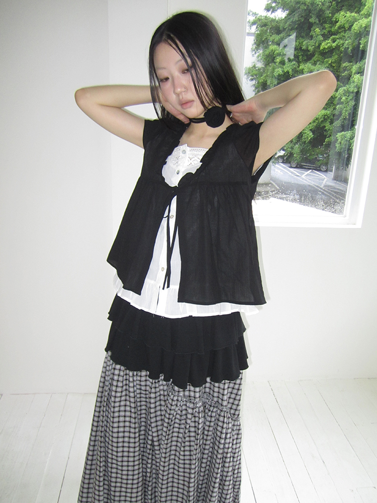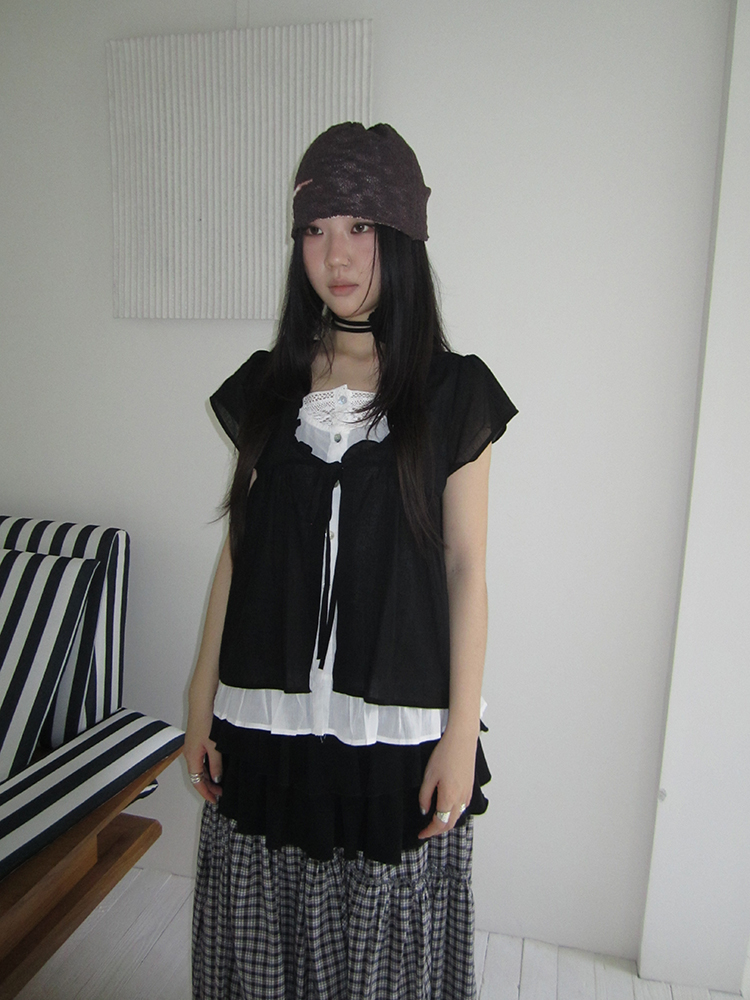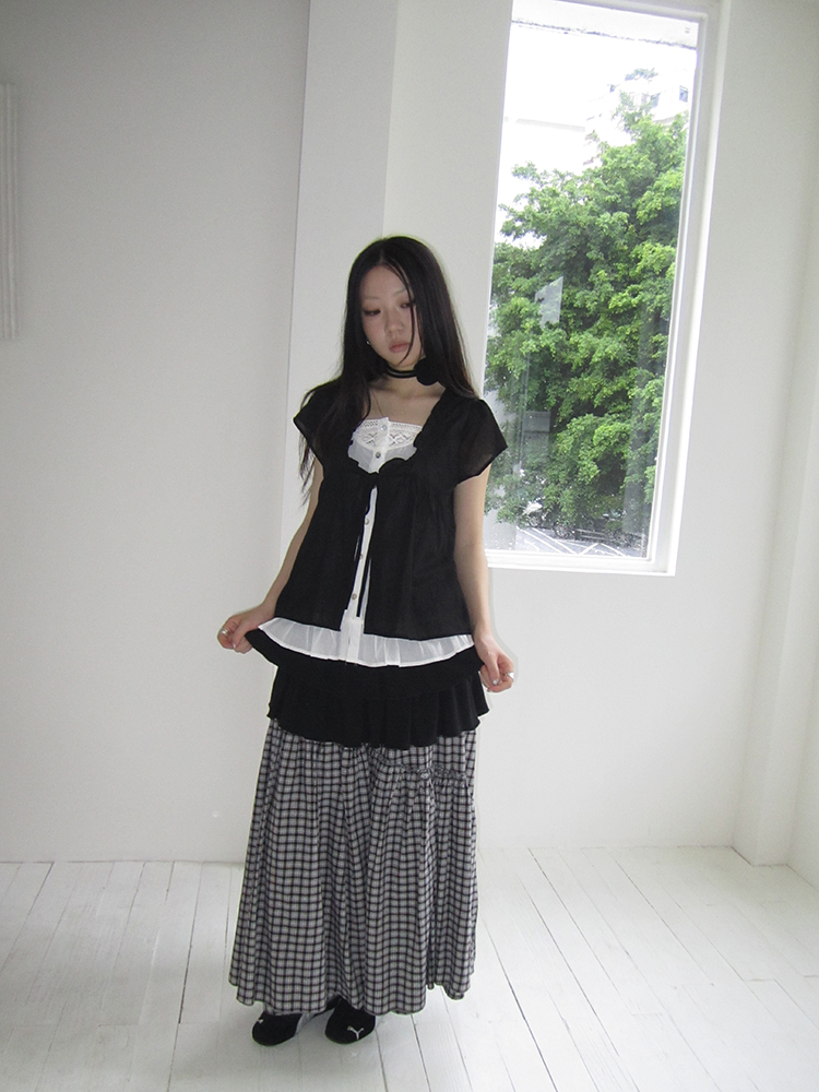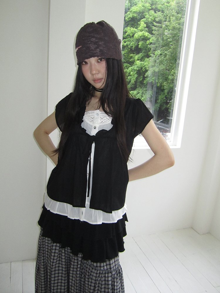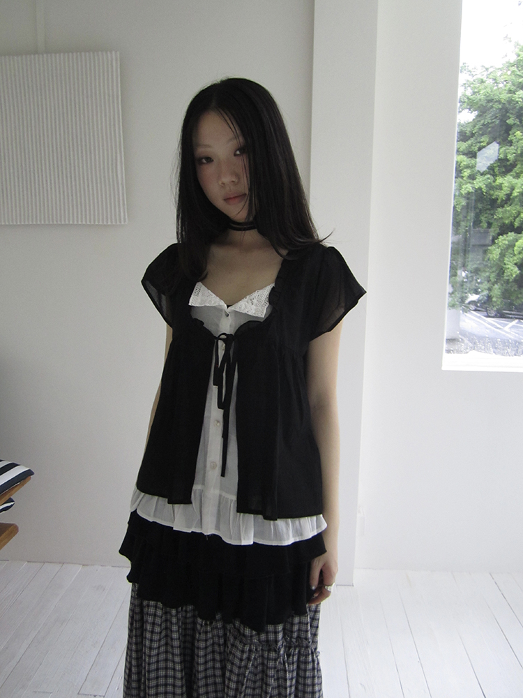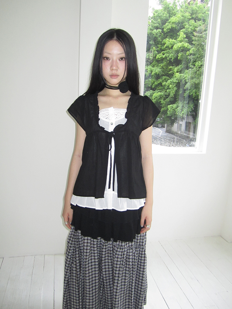 시어한 텍스처와 리본 스트랩이 매력적인 블랙 레이어 블라우스입니다.