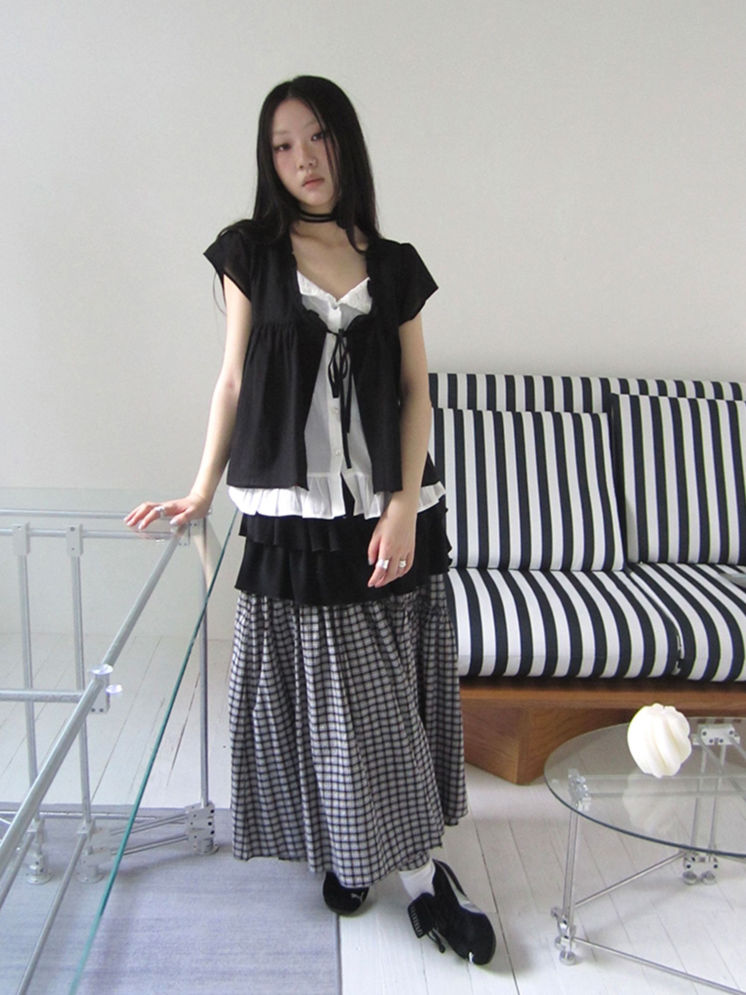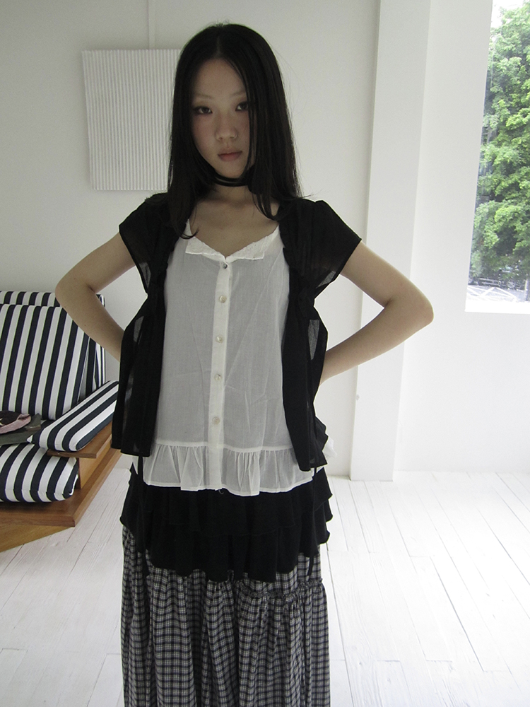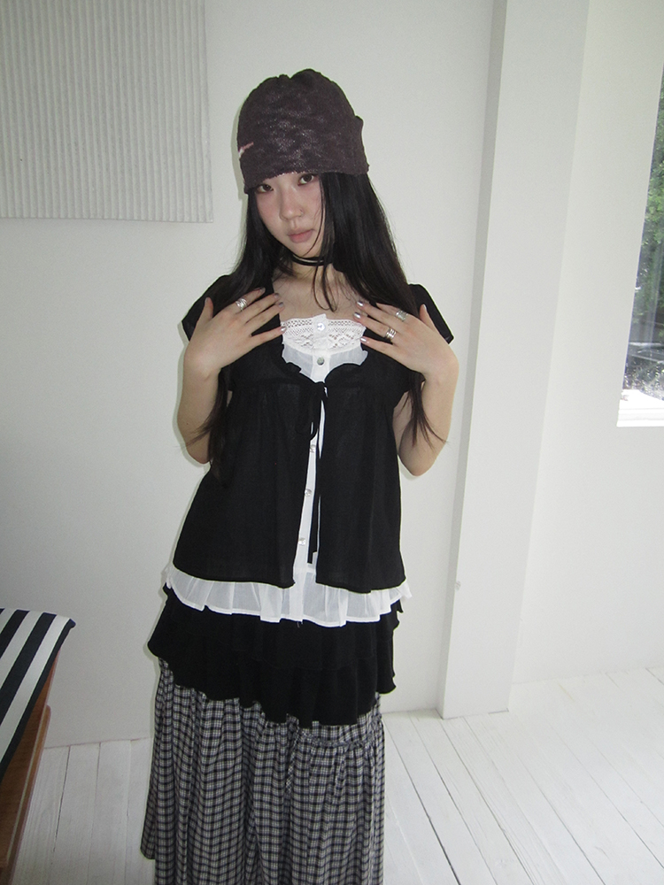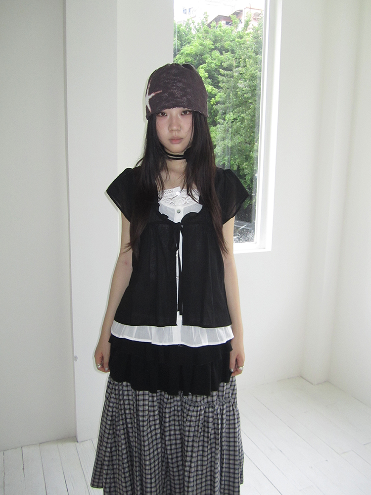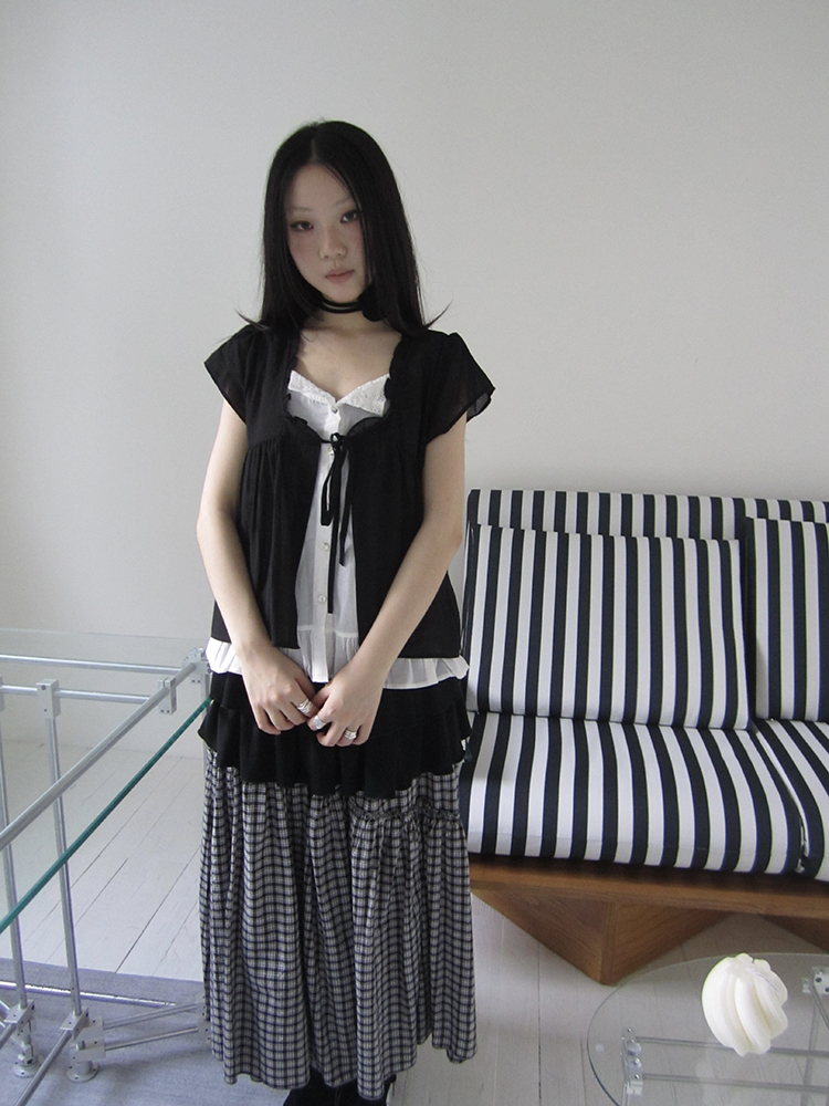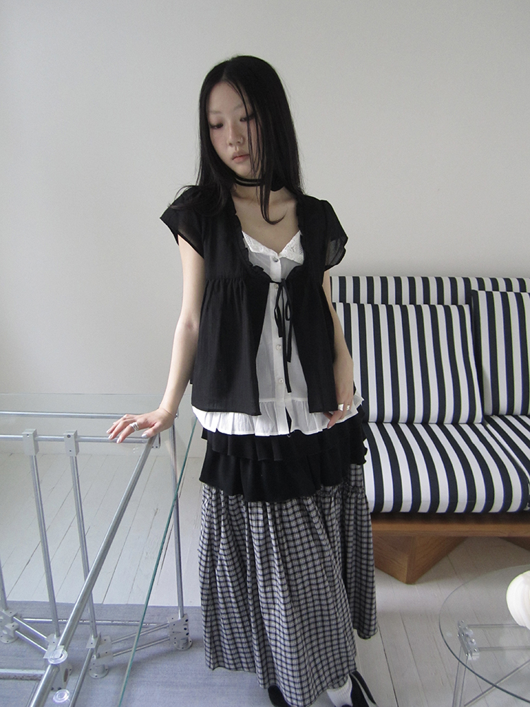 시어한 텍스처와 리본 스트랩이 매력적인 블랙 레이어 블라우스입니다.