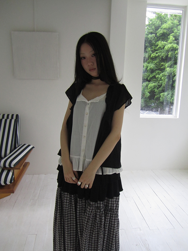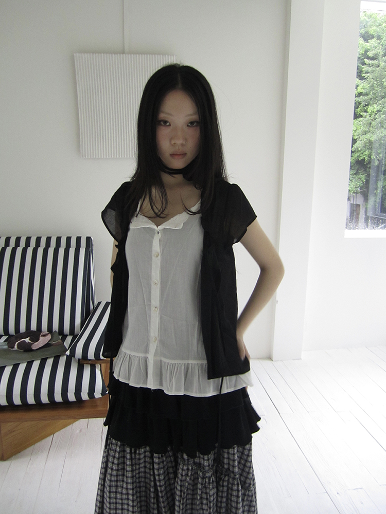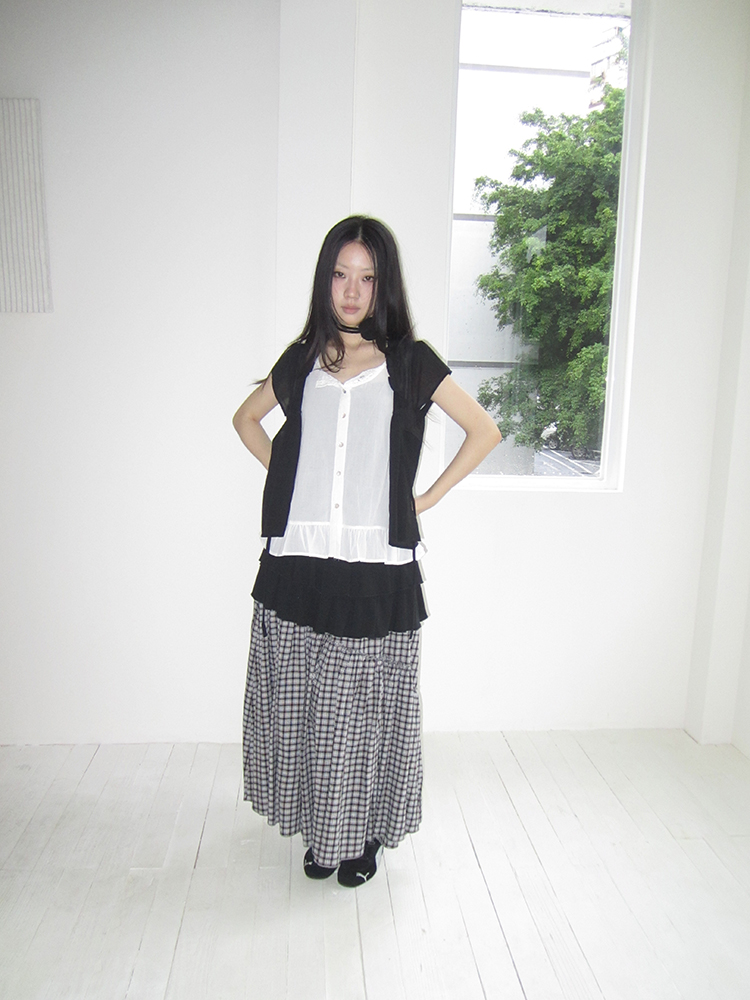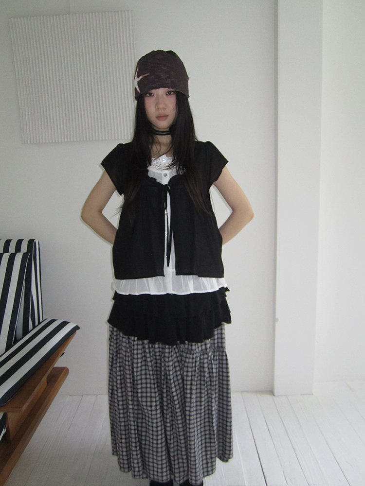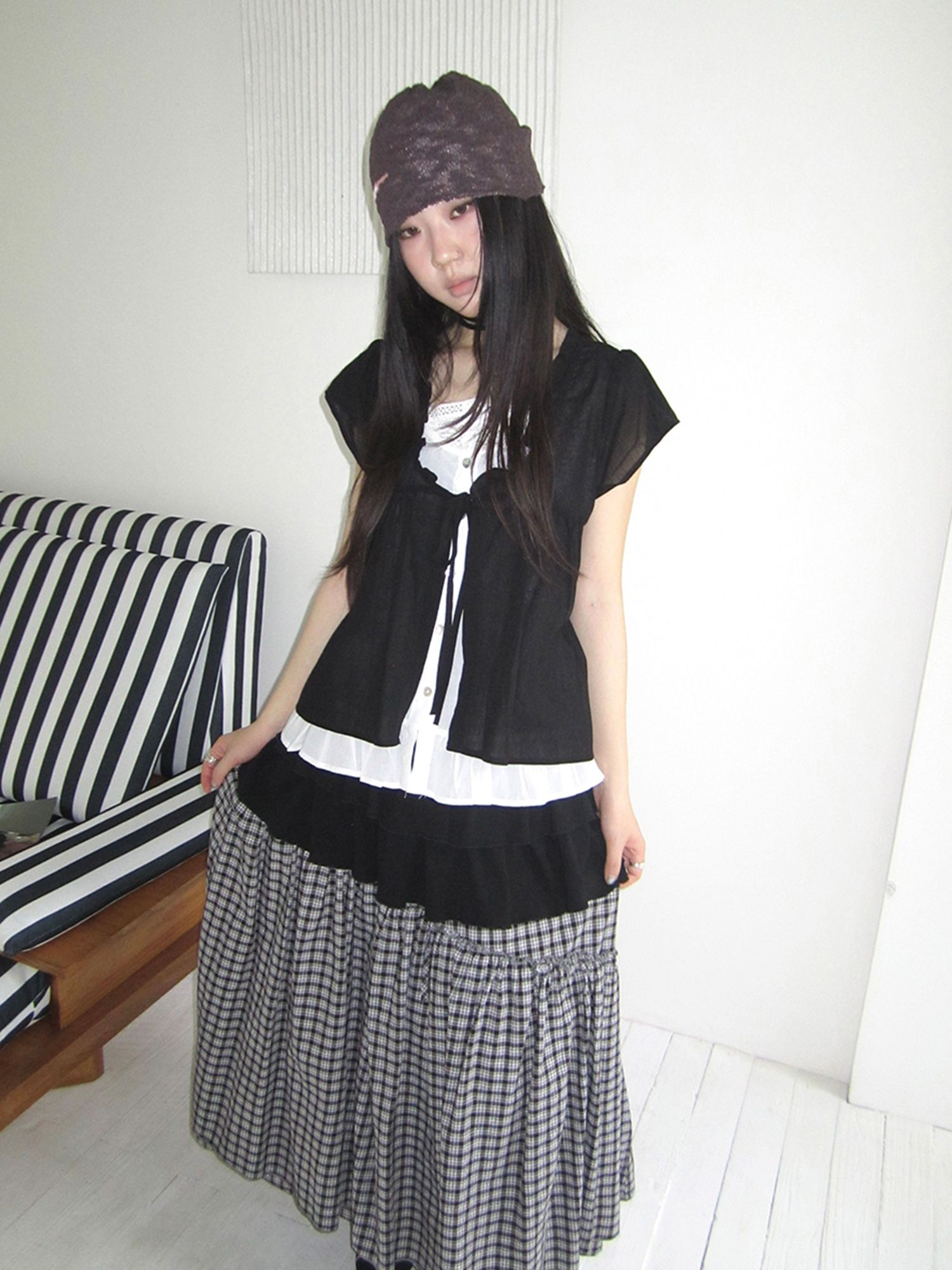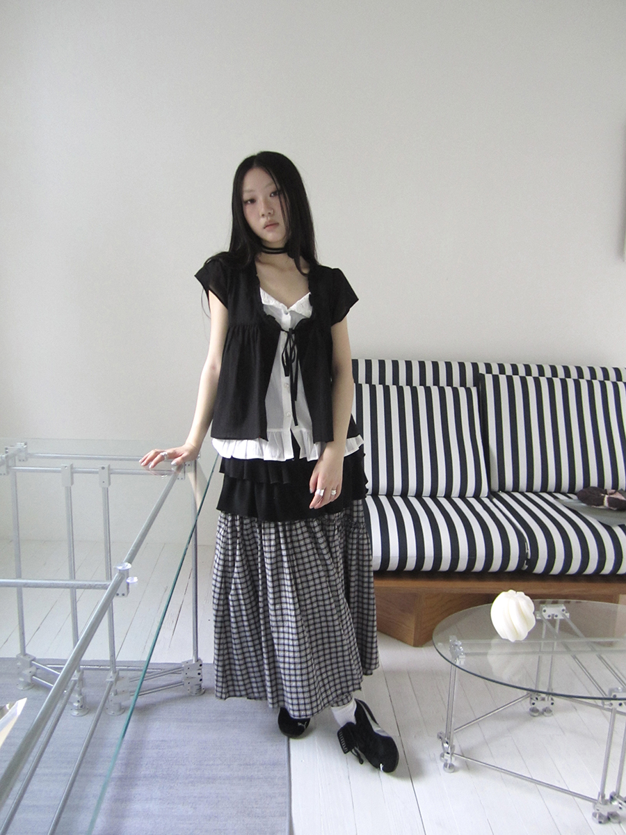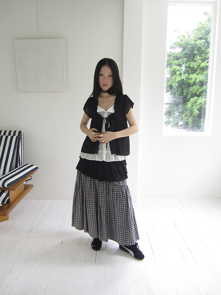 시어한 텍스처와 리본 스트랩이 매력적인 블랙 레이어 블라우스입니다.