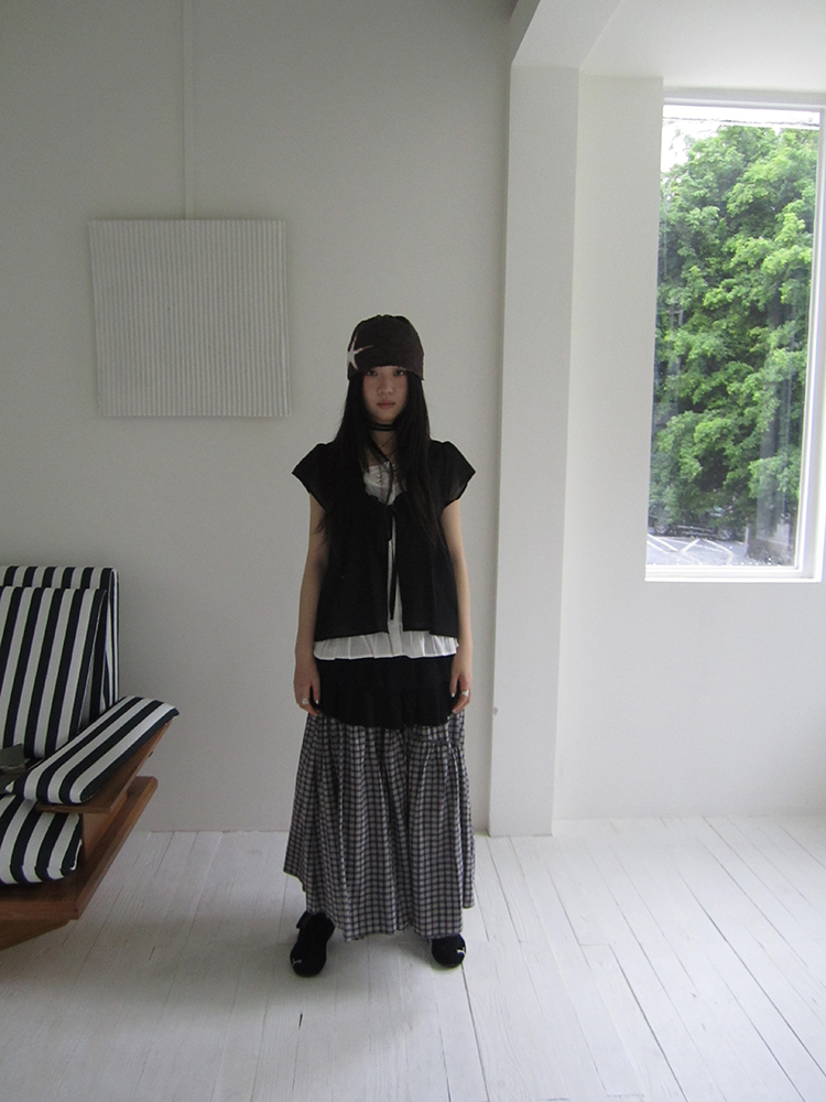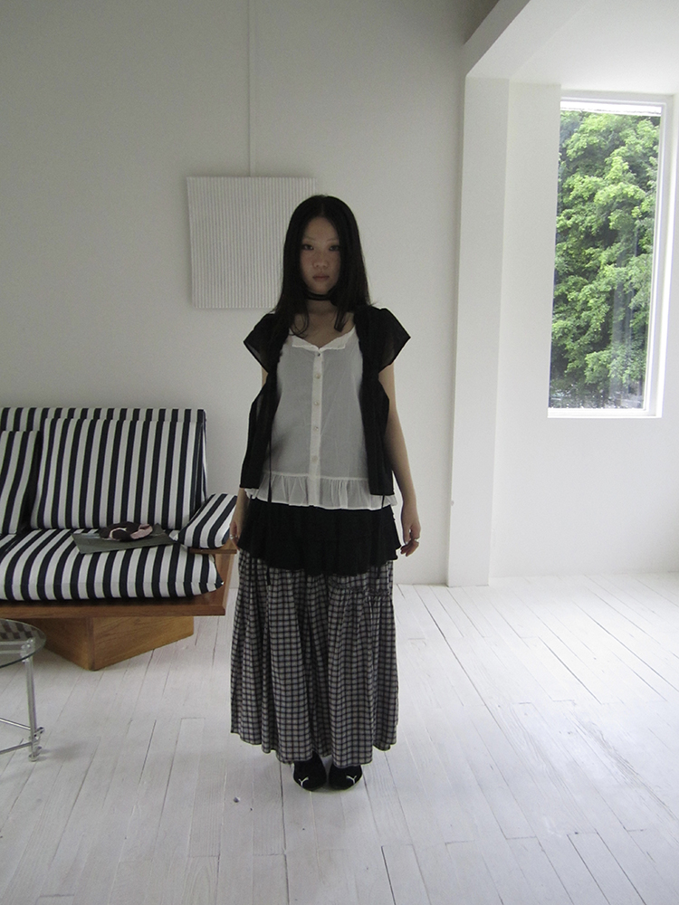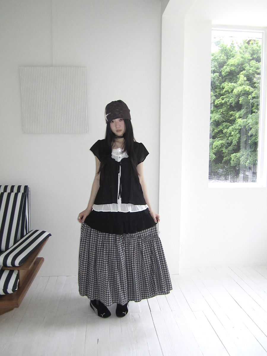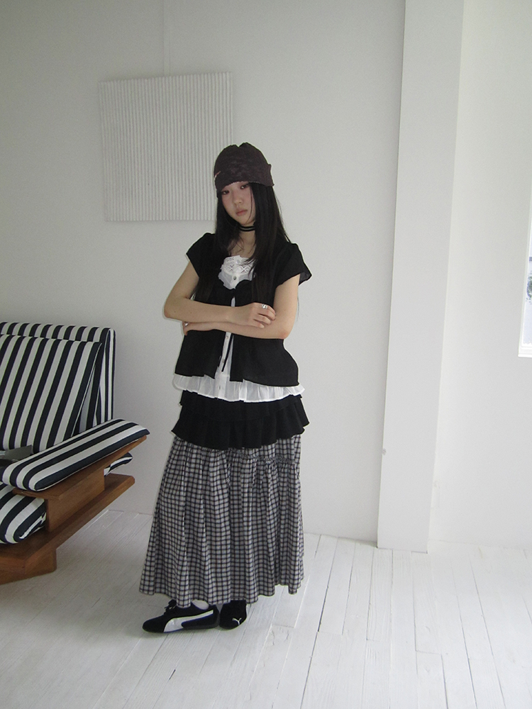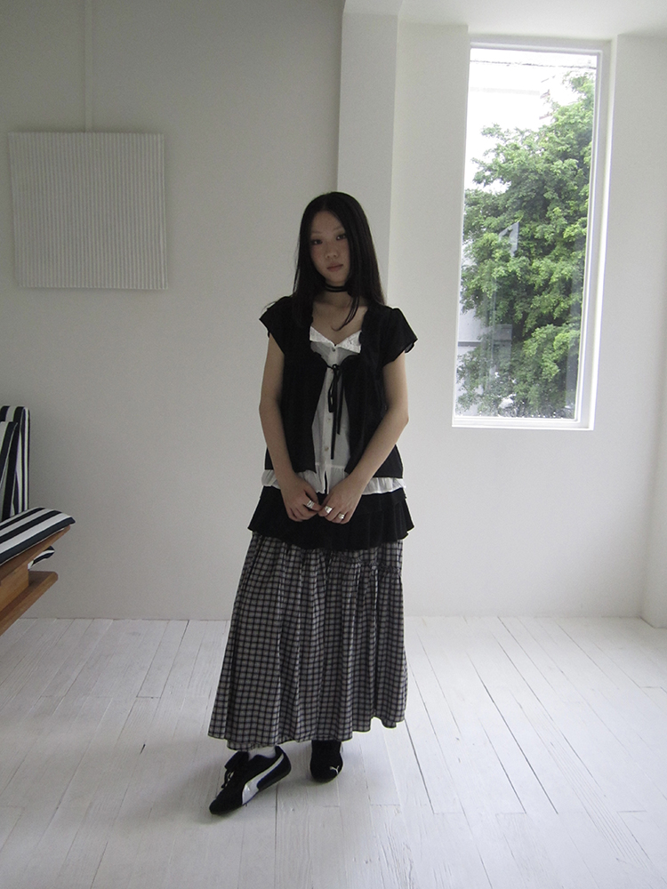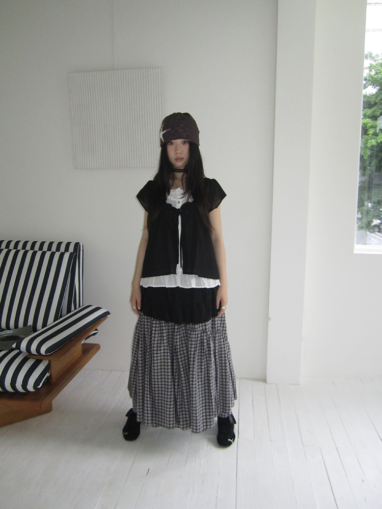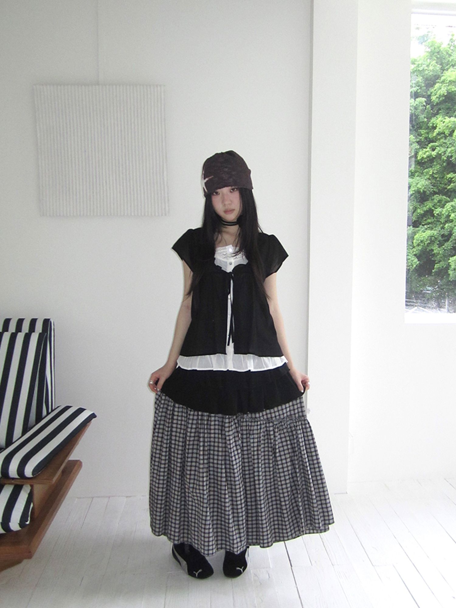 시어한 텍스처와 리본 스트랩이 매력적인 블랙 레이어 블라우스입니다.