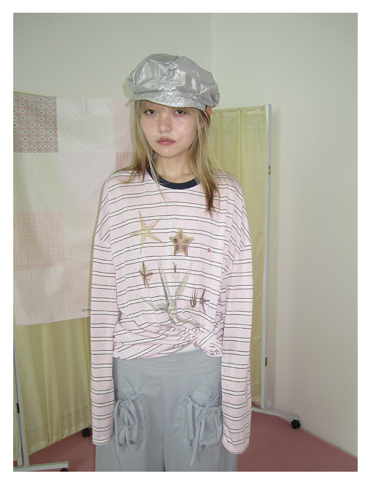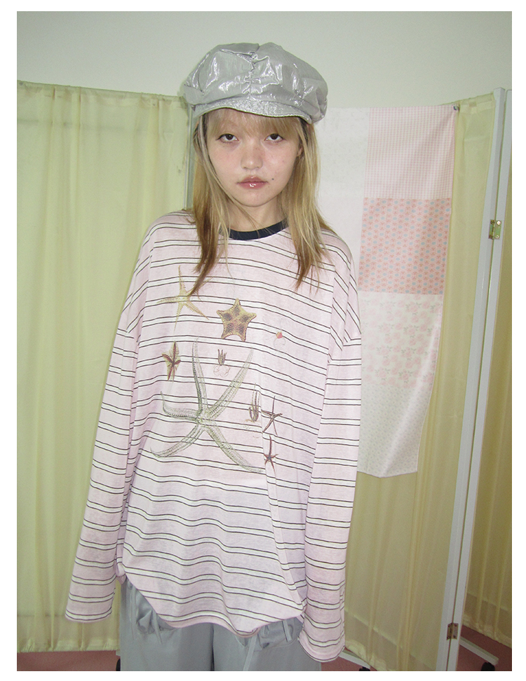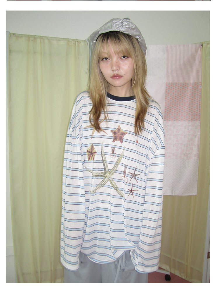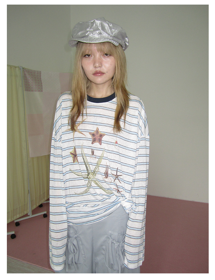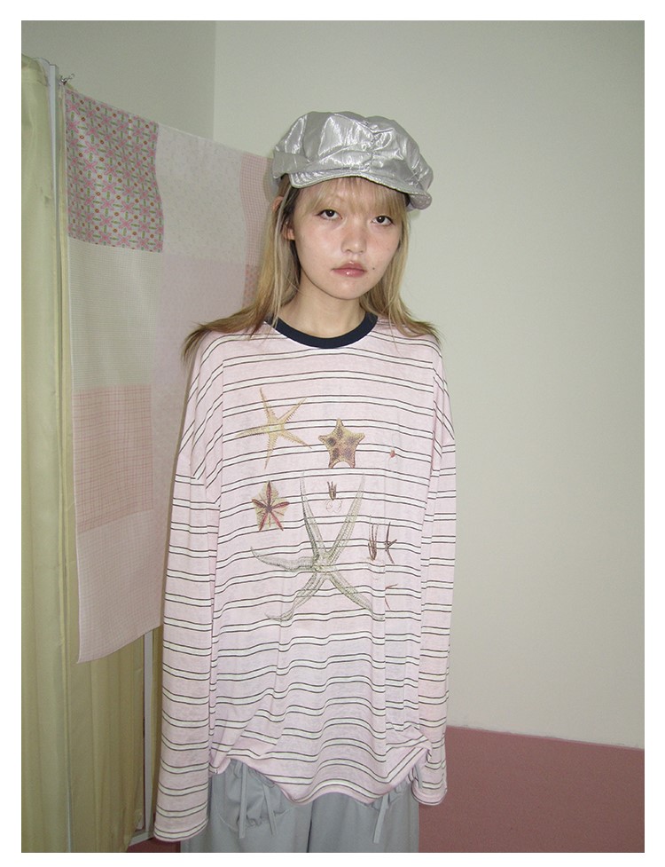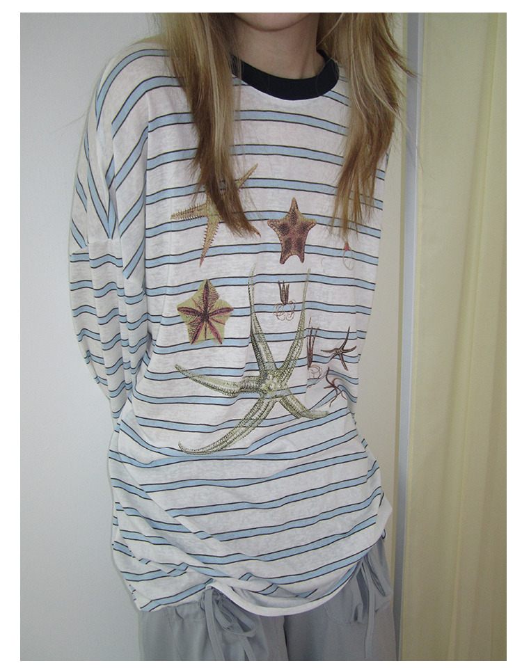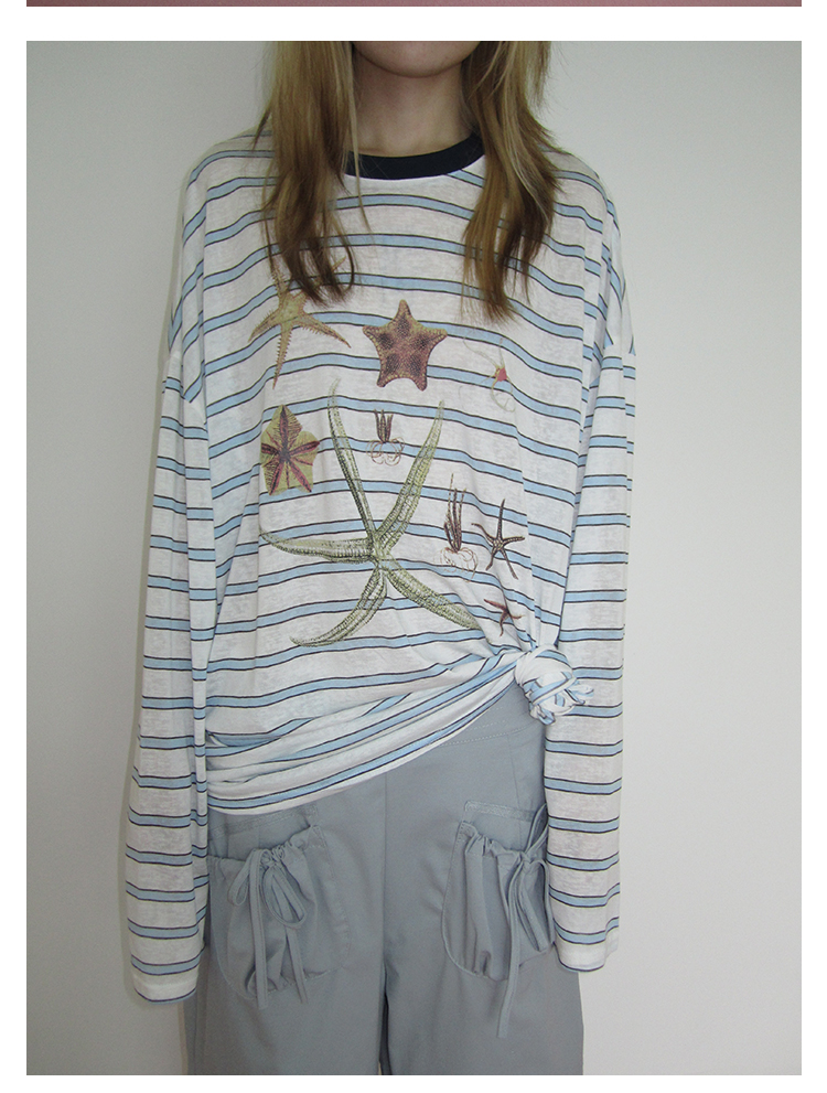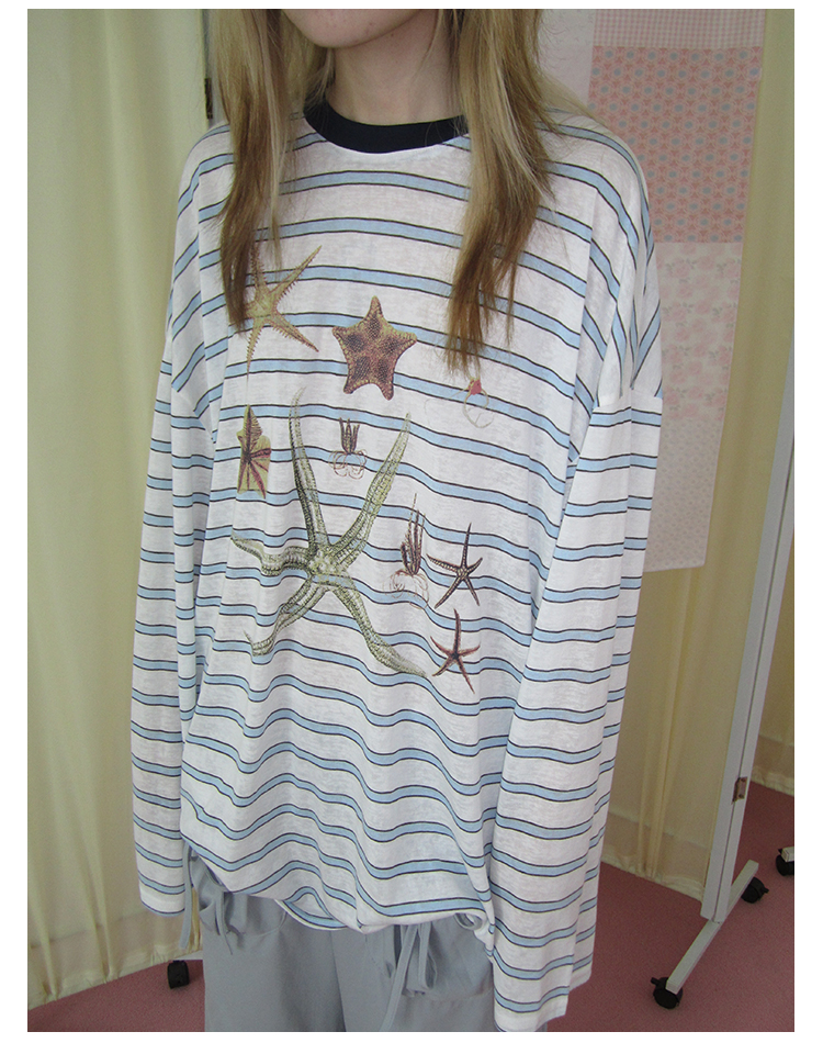 귀여운 바닷별이 총총 박힌 스트라이프 티셔츠입니다.