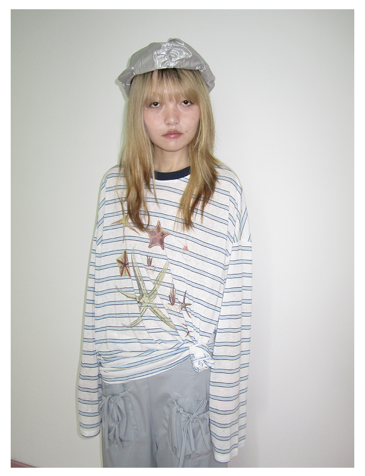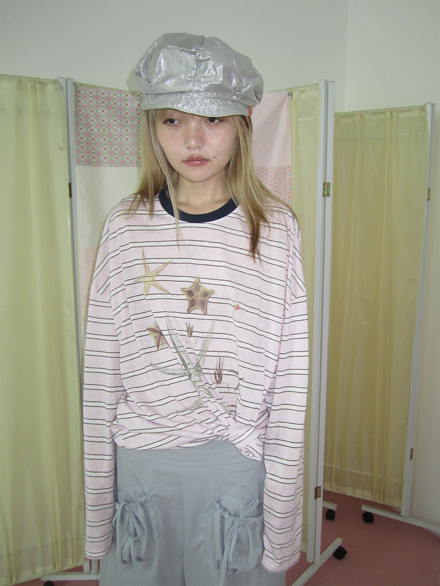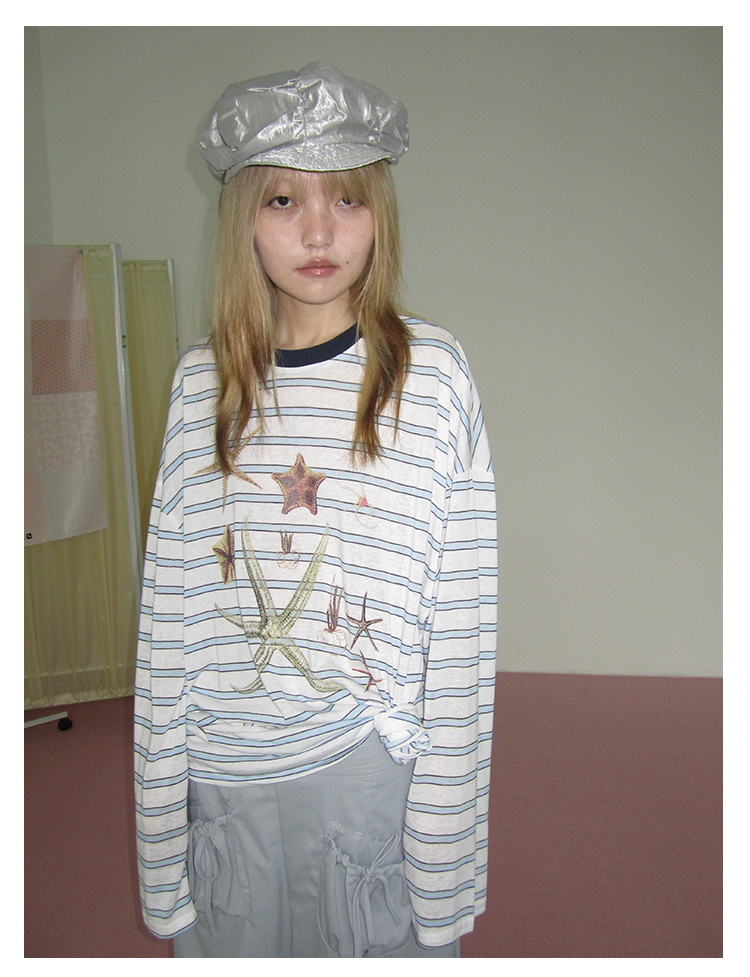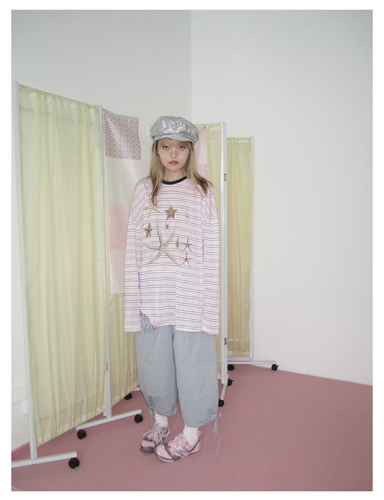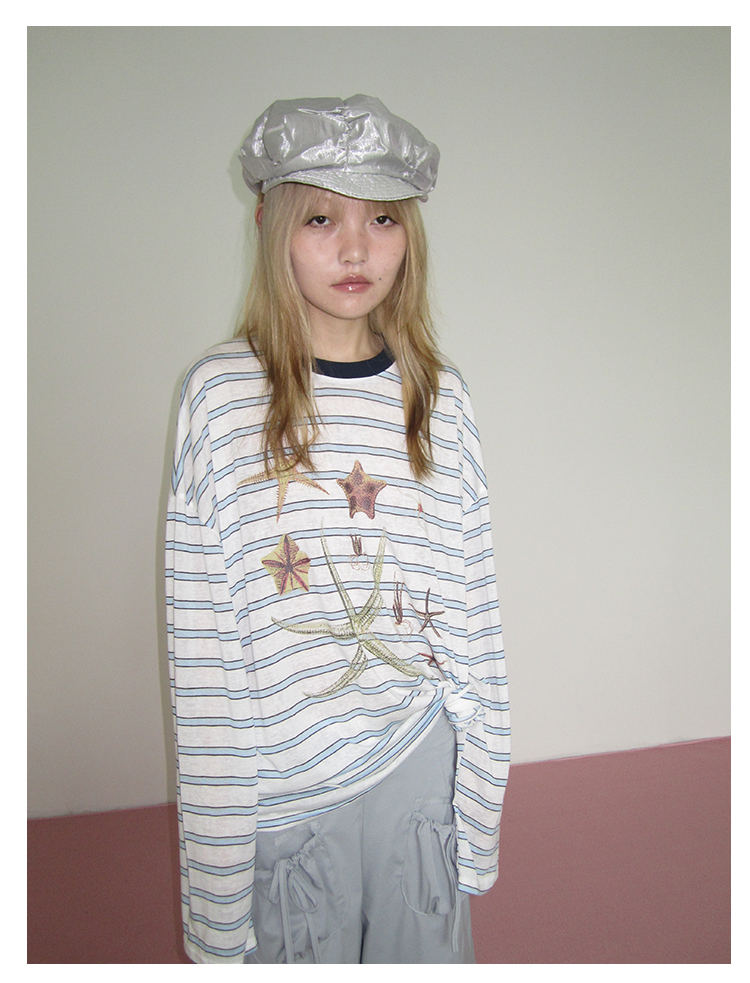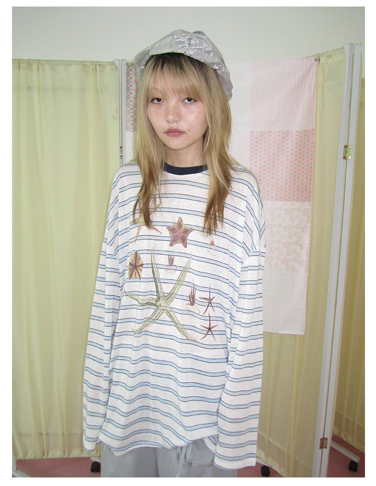 귀여운 바닷별이 총총 박힌 스트라이프 티셔츠입니다.