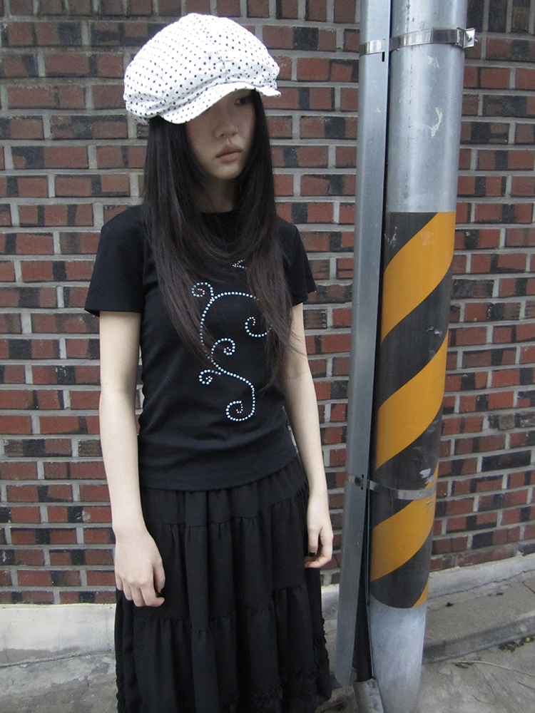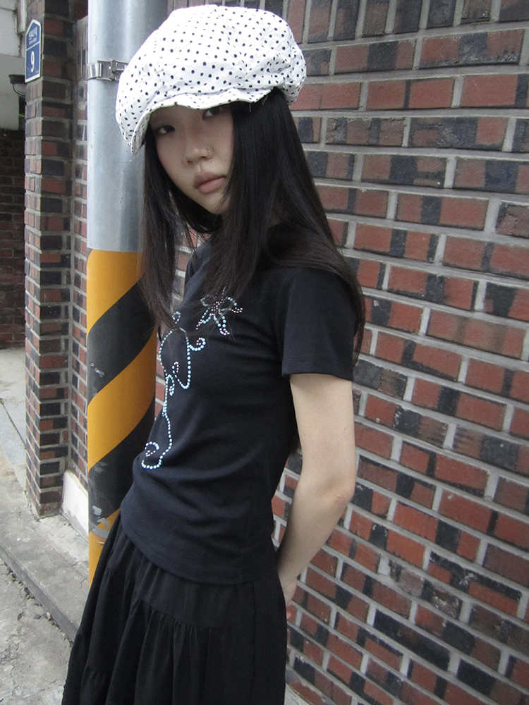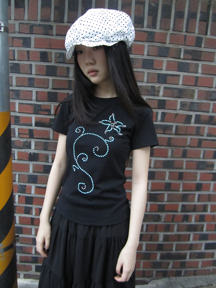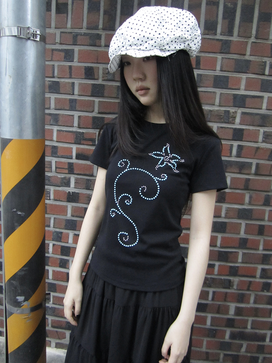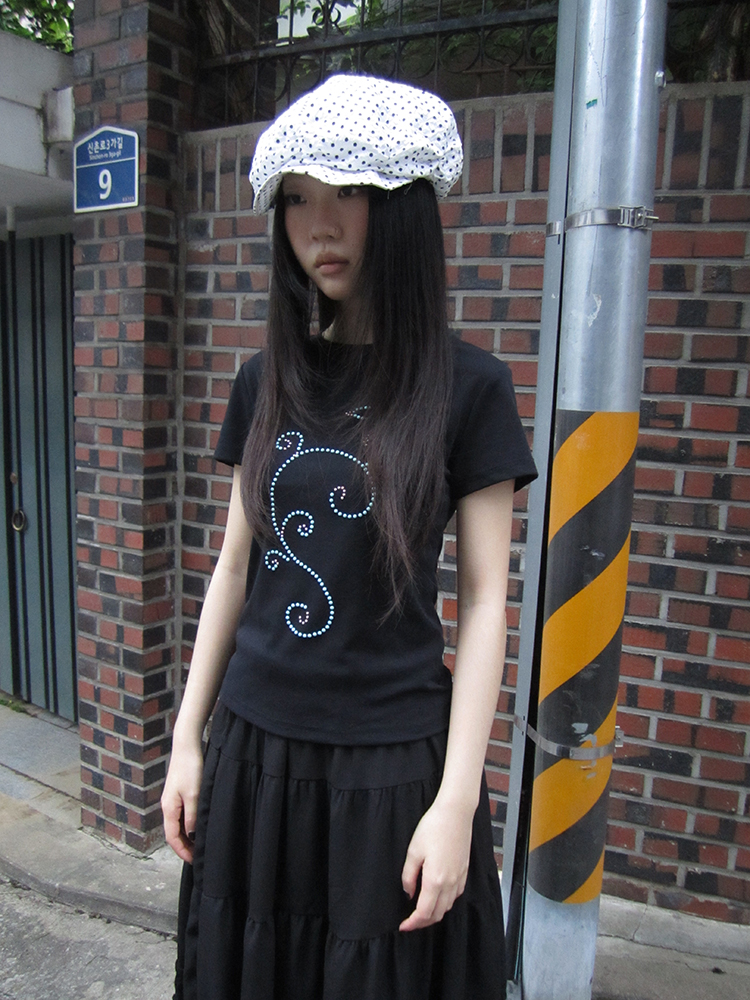 은은하게 반짝이는 큐빅 라인이 흐르는 티셔츠예요.