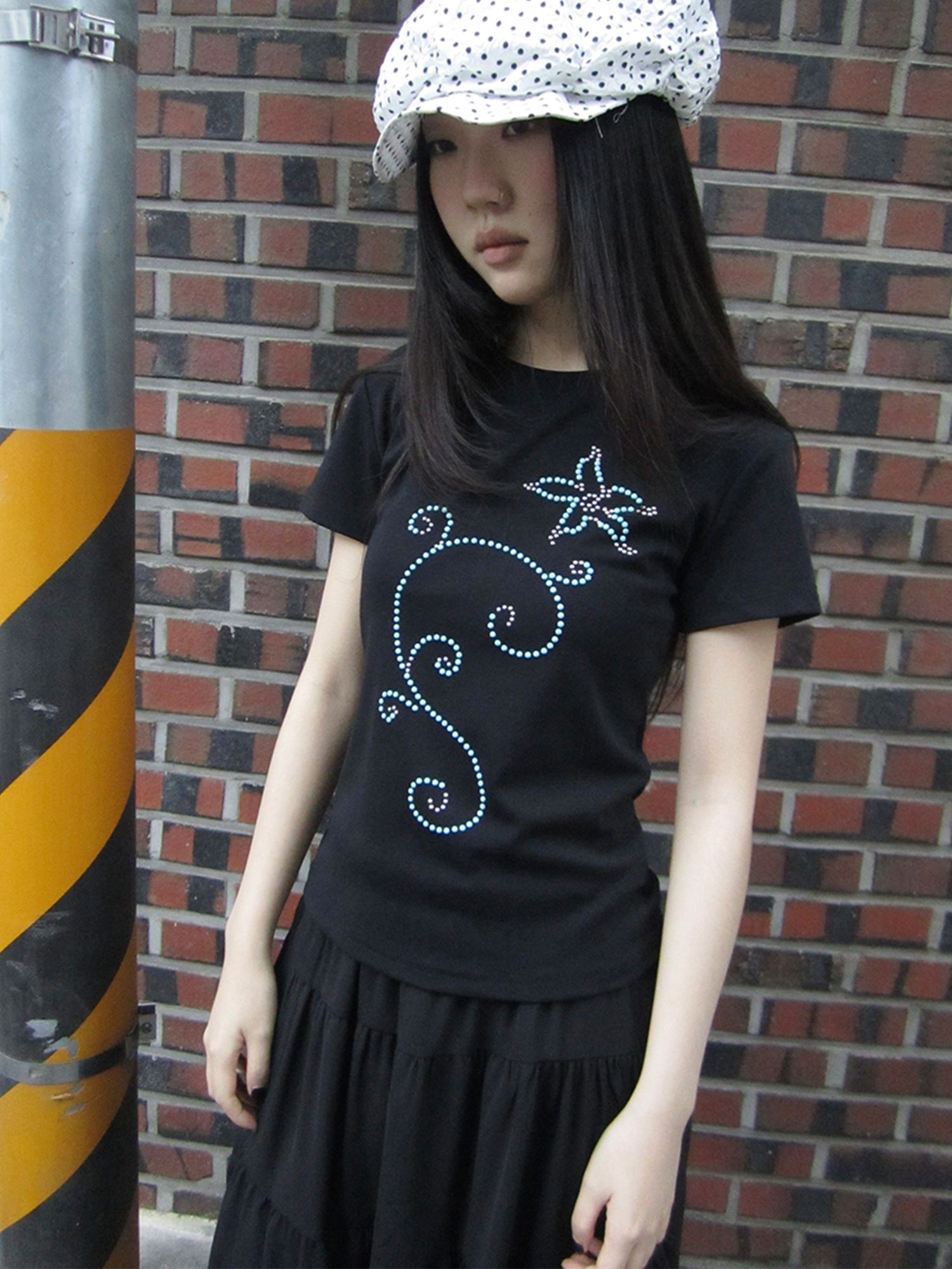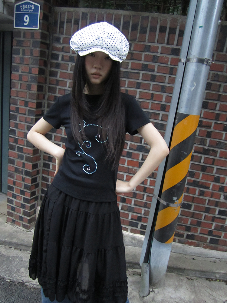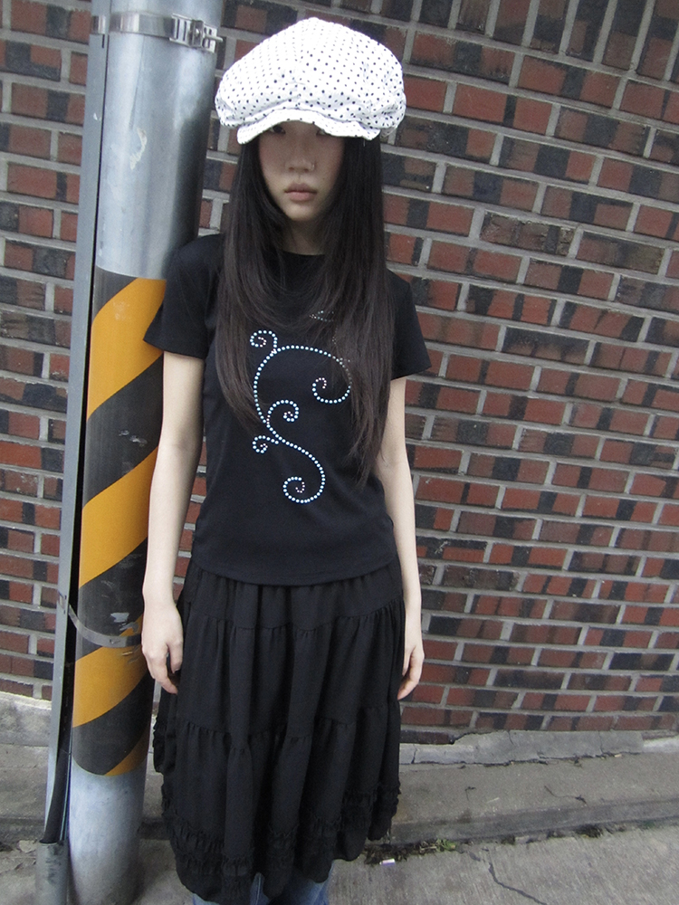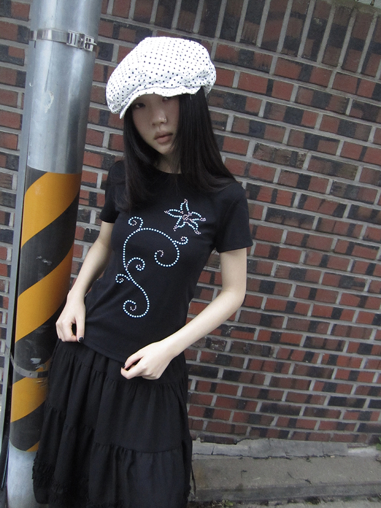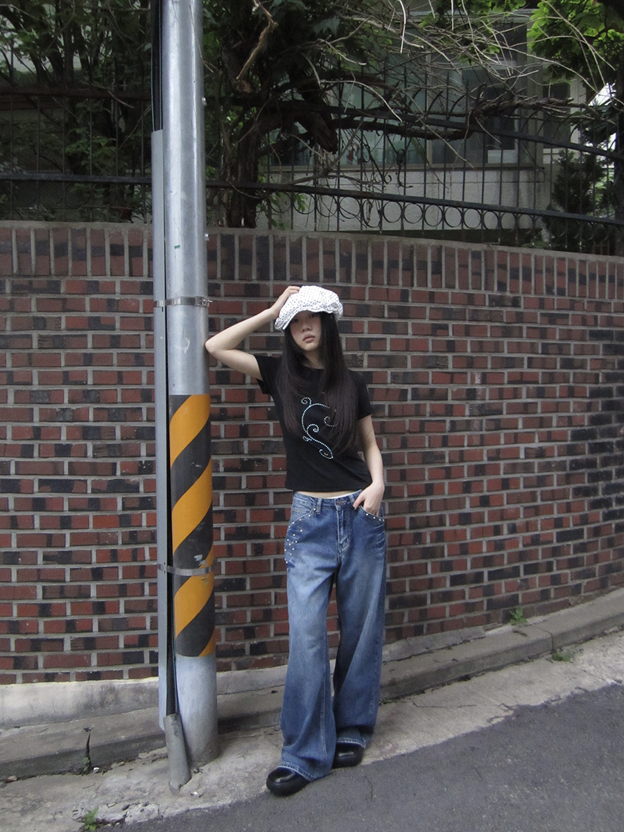 은은하게 반짝이는 큐빅 라인이 흐르는 티셔츠예요.
